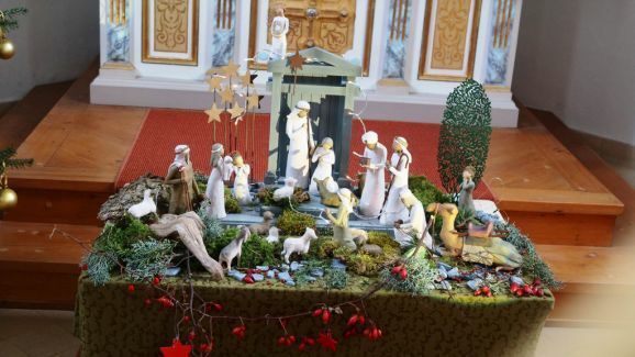 Vor allem der gesamte Altarbereich ist wieder wunderschön gestaltet worden. Die Mesnerfamilie Bernd und Rosmarie Schmid aus Hittelkofen hatte wie schon vergangenes Jahr beim Schmücken der Kapelle Helfer gefunden. So wurde von der Familie Groß aus Osterhofen die besonders beachtenswerte, ansprechende Krippe - eine Leihgabe von Zita Härle (Haisterkirch) – liebevoll, vor dem Altar aufgebaut.
