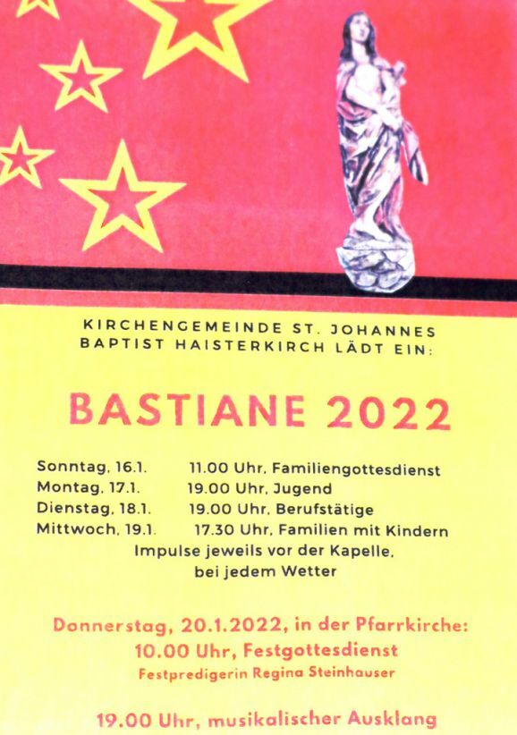 Am 20. Januar, dem Gedenktag des Heiligen, werden sich wieder besonders viele Gläubige - wenn auch in kleineren Gruppen - betend aufmachen, um das sakrale Kleinod aufzusuchen. Wegen der Pandemie-Regelungen musste - wie schon 2020 - auch heuer die große Wallfahrt nach dem Festgottesdienst am 20. Januar abgesagt werden. Die Kirchengemeinde St. Johannes Baptist Haisterkirch ist aber bemüht, jetzt im Januar mit besonderen Angeboten ihrem traditionellen „Bastiane-Feiertag“ gerecht zu werden.