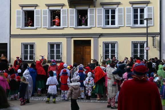 Auf der Hochstatt angekommen, wartete auf die Kinder eine Überraschung. Nach vielen kräftigen AHAs, Narrensprüchen aus voller Kehle und einfühlsamen Worten des Vizezunftmeisters Christoph Mayer zu der Situation der Kinder im ukrainischen Kriegsgebiet, gab es Bonbons aus den Fenstern des Hauses Mayer.