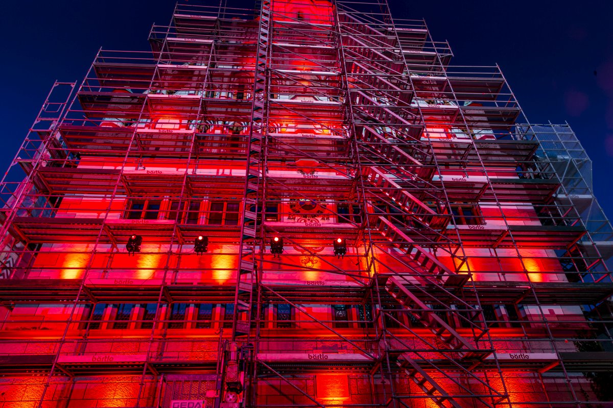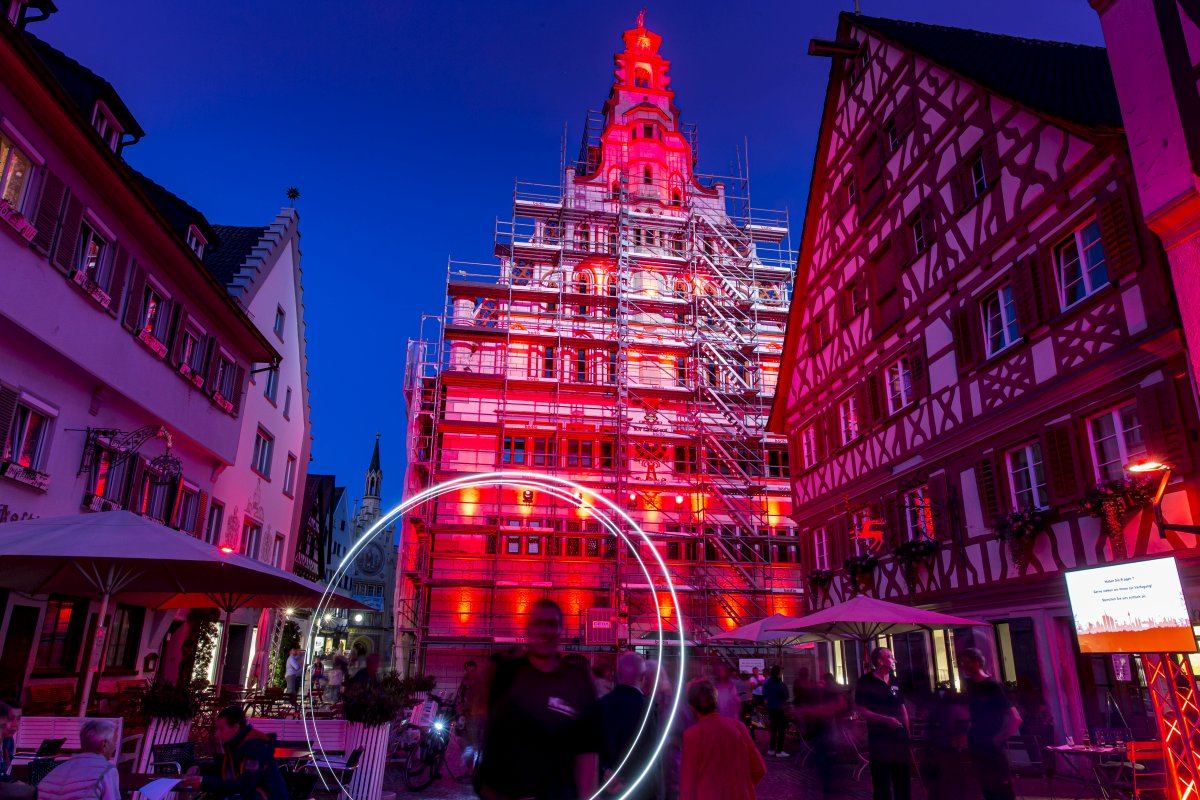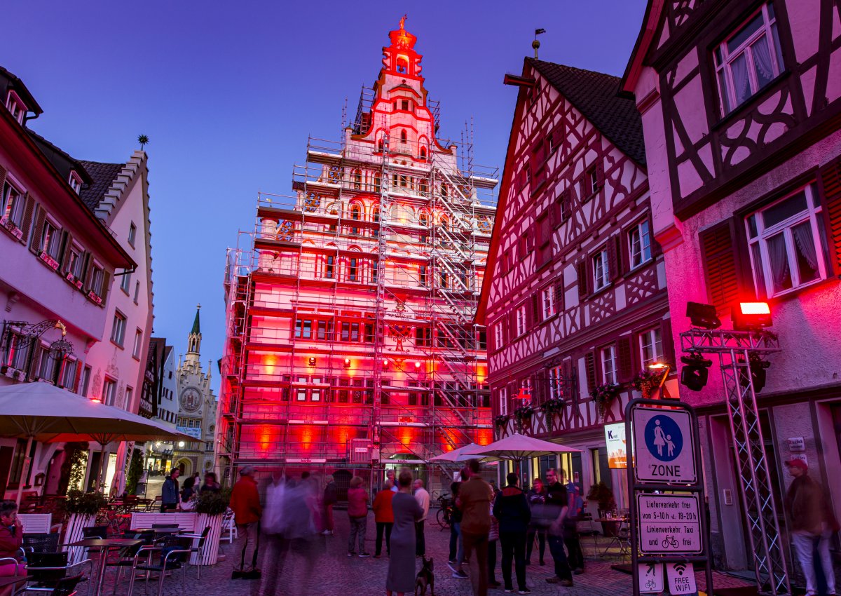Normalerweise stattet Johannes Knoll Festivals mit technischen Raffinessen aus. Nicht so in diesem Jahr. Mit einem kleinen Team wurden in Bad Waldsee nun rote „Mahnmale“ gesetzt. Dabei war eine gehörige Portion Flexibilität gefordert, denn die Rathausfront wurde pünktlich am Montag noch eingerüstet. Mit einem rot beleuchteten Kornhaus und roten Spots am Wurzacher Tor schufen die Techniker dennoch eine eindrucksvolle Stimmung in der Kurstadt.