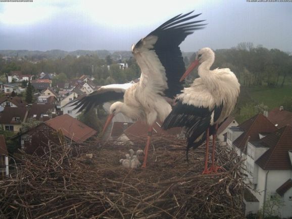 Um den 13. Mai sollen in Haisterkirch die Storchenküken schlüpfen. Nach zwei Wochen kann man frühestens die Wackelhälse der Storchenküken entdecken. Allerdings hat Ava dieses Jahr zuerst das Storchennest auf dem Kirchturm in Mühlhausen ausprobiert. Auch dort brütet inzwischen ein Storchenpaar. Als letztes wurde in Gaisbeuren mit der Brut begonnen. Dieses Jahr ist wieder ein Anfängerpaar in Gaisbeuren. Ein unberingter Herr Storch und eine Schweizer Störchin, die 2020 am Lützelsee bei Zürich geschlüpft ist.