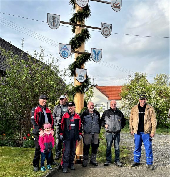Johann Nothhelfer ist da auf die Mithilfe treuer Maibaumfreunde angewiesen. Neben dem Team beim Kranzen waren dies (siehe Foto von links): Matthias Sontag mit Töchterchen Ida, Josef Ruther, Joachim Sontag, Johann Nothhelfer, Georg Ströbele, Siegfried Maucher. Es fehlt Andreas Sontag auf dem Foto.