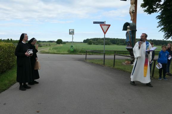 Nach diesem Satz des Pfarrers trennten sich die Wege: Während die Schwestern einen Gottesdienst mit Pfarrer Ulrich Steck im Kloster feierten, ging es für die Gemeinde weiter in Richtung Flugplatz. Nach einer Station am Scheuerlehof ging es auf den Weg zur Riedmühle. Bei der Kleingartenanlage wurde um den Frieden in der Welt gebetet.
