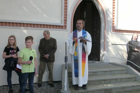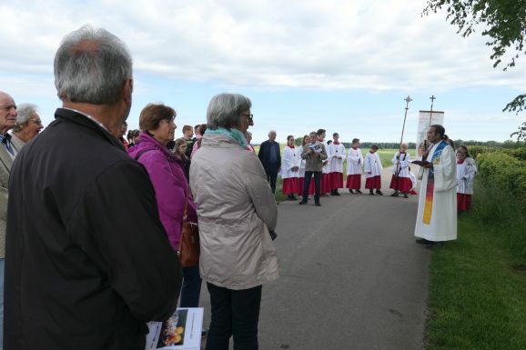 In Reute traf sich am Himmelfahrtstag die Kirchengemeinde am Klosterfriedhof, um zusammen mit den Franziskanerinnen den Feiertag festlich zu eröffnen. Pfarrer Stefan Werner freute sich über die zahlreiche Teilnahme der Gemeinde und der Schwestern. Gut vertreten waren auch die Ministranten und die Erstkommunionkinder. „Wahrnehmend, wertschätzend und weltoffen, so wollen wir in der großen Bittwoche durch unsere Fluren pilgern“.
