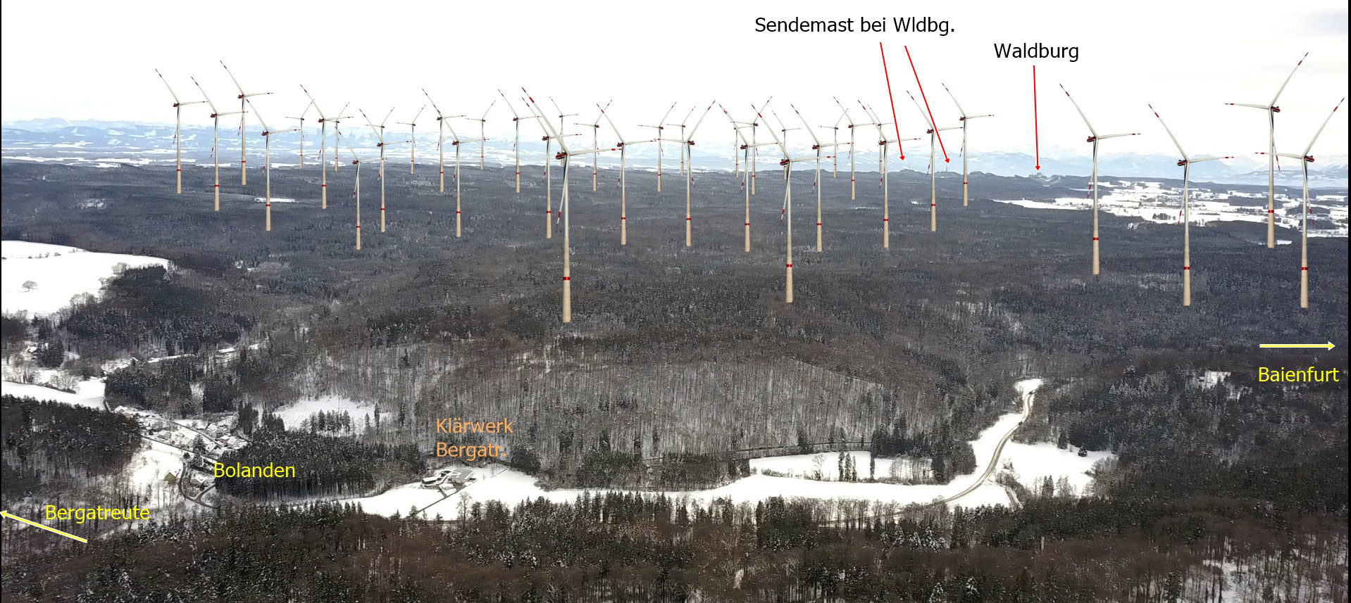 Region - So wird der Blick auf den planten Windpark im Altdorfer Wald aussehen (Drohnenaufnahme über Gambach bei Bergatreute) – falls Realität wird, was die Windkraft-Industrie mit Macht anstrebt, ausgestattet mit kräftigem Rückenwind von Stuttgart her, von Seiten der grün geführten Landesregierung.