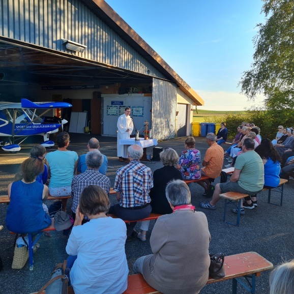 Reute - Im Rahmen der Sonntagabend-Gottesdienste des Pastoralteams fand an diesem Sonntag auf dem Flugplatz in Reute ein besonderer Wortgottesdienst statt. Pastoralreferent Andreas Hund freute sich, dass sich etwa 80 Personen aus der gesamten Seelsorgeeinheit am Flugplatzhangar eingefunden haben.