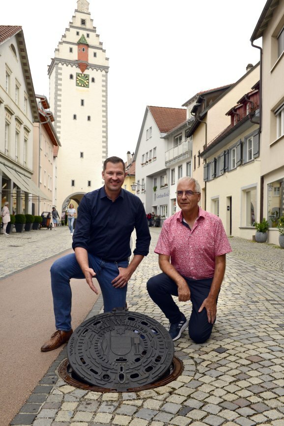 BAD WALDSEE – Als i-Tüpfelchen der Arbeiten für „Altstadt für Alle“ in der bis jetzt umgebauten Altstadt, kann man die neuen Schachtabdeckungen mit dem Wappen der Stadt Bad Waldsee bezeichnen. Im Rahmen der Arbeiten für die barrierefreie Innenstadt wurden auch die Nahwärme- und Breitbandleitungen verlegt und baulich in bestehende Wasser- und Abwasserschächte eingegriffen.