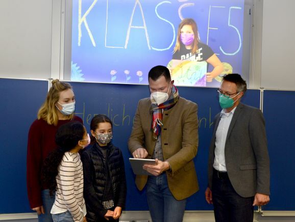 Bad Waldsee - Wirklich gerührt war Oberbürgermeister Matthias Henne beim Besuch der Klasse 5a der Döchtbühlschule, denn die Schülerinnen und Schüler haben sich für ihr neues digitales Klassenzimmer mit einem extra gedrehten Videofilm und einem gemeinsamen „Vielen Dank für das tolle Klassenzimmer und die schönen neuen Tische und Stühle“ bedankt. „Vielen Dank an euch, dass ihr das so wertschätzt, das berührt mich wirklich sehr“, freute sich der Oberbürgermeister.