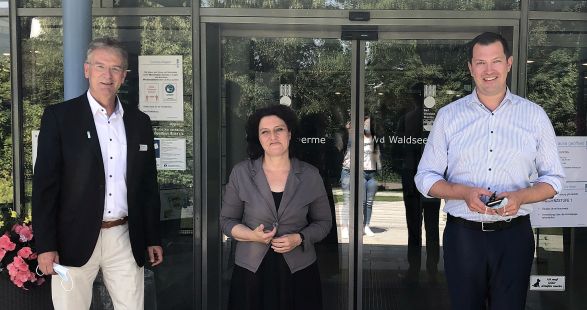 Bad Waldsee - Bürgermeister Matthias Henne und Direktor Peter Blank trafen sich mit der ehemaligen niedersächsische Gesundheitsministerin Dr. Carola Reimann, die sich derzeit als Patientin in den Städtischen Rehakliniken befindet zu einem Erfahrungsaustausch. Dabei standen sozialpolitische und pandemiebedingte Fragestellungen im Vordergrund.