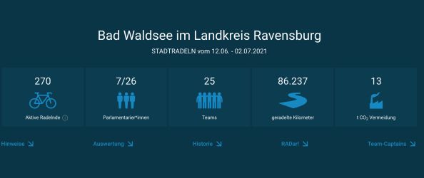 Bad Waldsee - Die Stadt Bad Waldsee hatte sich bei der bundesweiten Aktion „Stadtradeln“ in diesem Jahr erneut dem Landkreis Ravensburg angeschlossen. Das starke Ergebnis steht nun fest: Vom 12. Juni bis zum 12. Juli radelten die für Bad Waldsee registrierten Teilnehmer sage und schreibe 86.237 Kilometer. Im Jahr zuvor waren es noch 62.953 Kilometer gewesen.