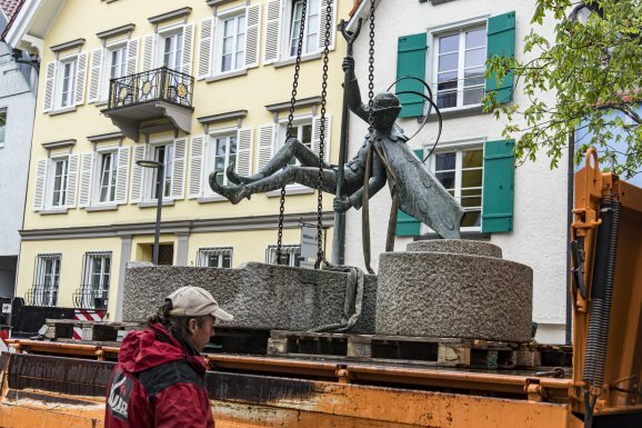 Bad Waldsee - Spektakuläre Anblicke haben Bauarbeiten im Zusammenhang mit dem Projekt „Altstadt für Alle“ vor zwei Wochen geboten: Der Federlebrunnen auf der Hochstatt hat seinen Platz übergangsweise verlassen, um Platz zu schaffen für die umfangreichen anstehenden Bauarbeiten.