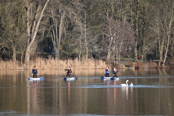 Bad Waldsee - Die ersten Sonnenstrahlen nach dem Wintereinbruch locken die SU-Paddler auf den Stadtsee. Frohgemut paddeln sie mit dem Schwänen um die Wette, trotz Eisresten in der Uferzone.