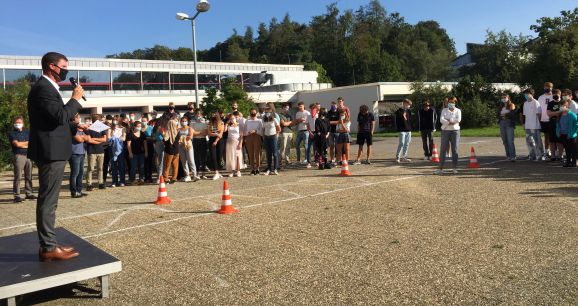 Bad Waldsee - Pünktlich zum Schulbeginn am 14.09.2020 und bei strahlendem Sonnenschein begrüßte der neue Schulleiter, Mark Overhage, die Schülerschaft des Gymnasiums. Er freue sich, eine tolle Schule übernehmen und leiten zu dürfen, vor allem aber darauf, gemeinsam tolle Schule machen zu dürfen. Sehr persönlich stellte sich der neue Schulleiter Corona bedingt zunächst den neuen Klassen 12 - 9 und im Anschluss den Klassen 8 - 6 auf dem Schulhof vor.