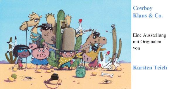 Bad Waldsee - Seit 2007 reitet der kleine Cowboy Klaus zusammen mit Schwein Lisa und Kuh Rosi durch die Bücher von Karsten Teich und Eva Muszynski und begeistert mit seinen Abenteuern Klein und Groß. Ob beim Ritt auf dem pupsenden Pony, im Kampf gegen den fiesen Fränk, bei der Rettung der wilden Hühner oder bei der Suche nach Gold, in jedem Buch gibt es jede Menge witzige, skurrile und detailreiche Illustrationen, die zum Betrachten einladen. Das pupsende Pony ist sogar beim WDR durch die „Sendung mit der Maus“ getrabt.