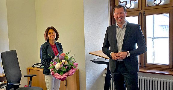 Bad Waldsee - Mit einem Blumenstrauß hat Bürgermeister Matthias Henne am vergangenen Dienstag die neue Erste Beigeordnete, Monika Ludy, an ihrem Arbeitsplatz im Rathaus herzlich willkommen geheißen. „Ich freue mich sehr, dass die Rathausspitze nach fünf Monaten wieder komplett besetzt ist“, sagte Henne.