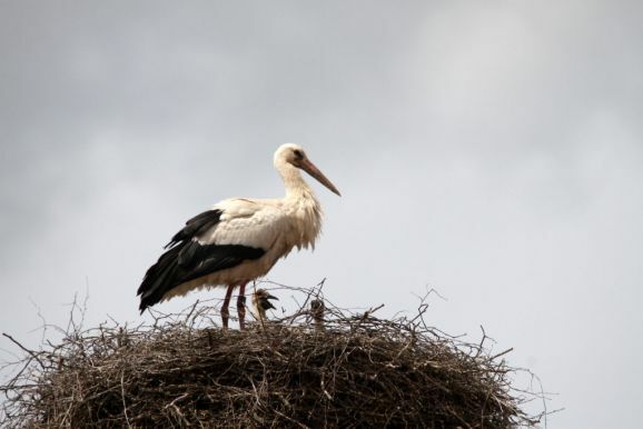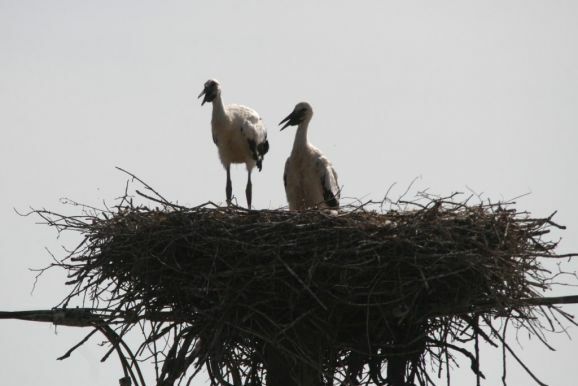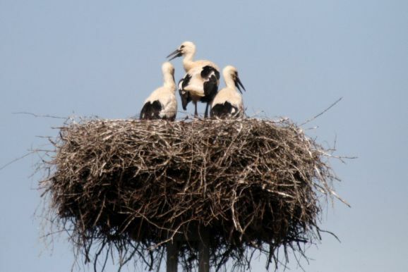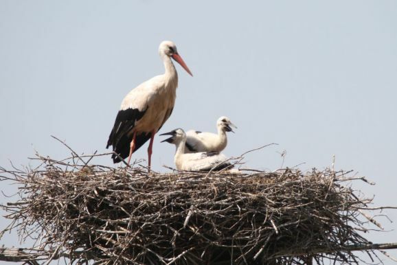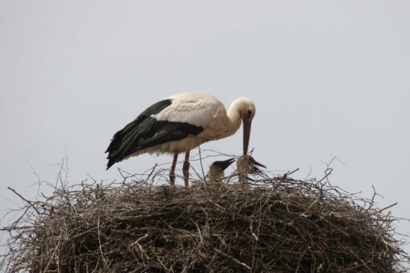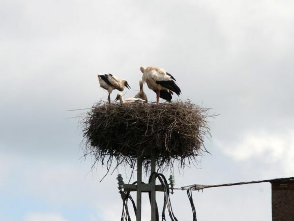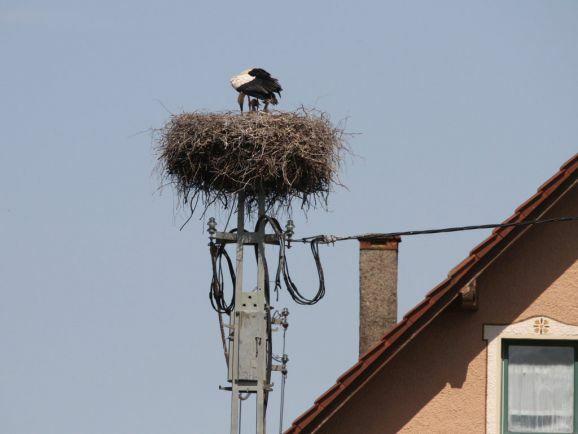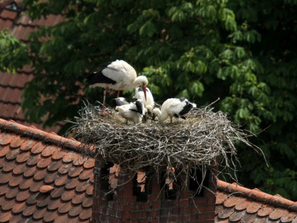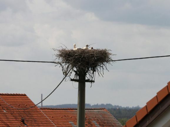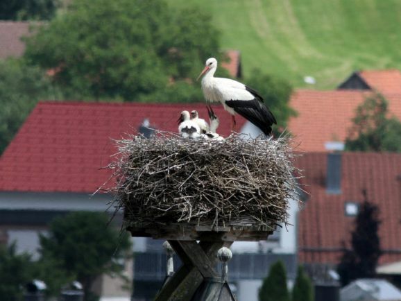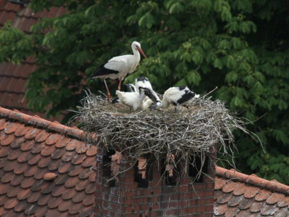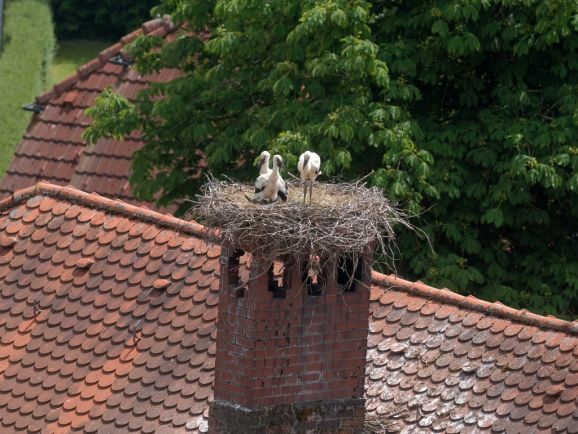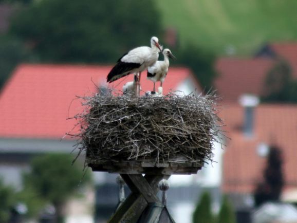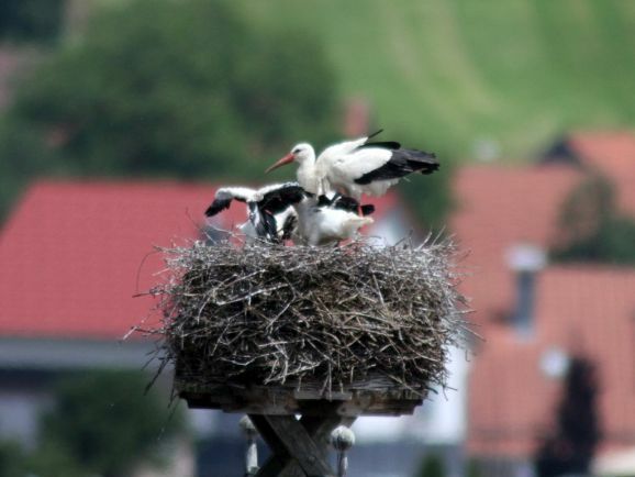 Er wurde von seinem Brutpartner kurzfristig ausgetauscht, wie Ulrich Grösser, der die Nester regelmäßig mit seinem Spektiv beobachtet, feststellte. Denn noch im März war beim Nestbau der zweite Altvogel ebenfalls ein beringter Storch gewesen. Seit dem Ende der ersten Maiwoche streiten nun drei kleine Jungstörche um das von den Eltern herbeigeschaffte Futter.