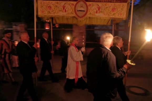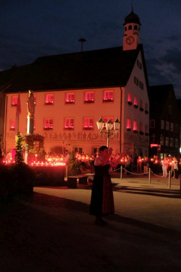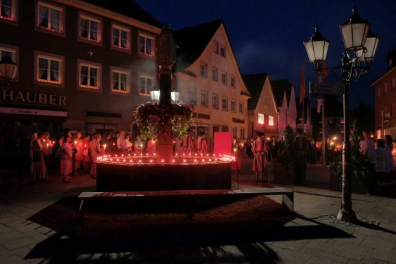 Nachdem Pfarrer Maier die Gläubigen zum ersten mal an diesem Abend mit der Reliquienmonstranz gesegnet hatte und diese ihre Kerzen entzündet hatten, trug er die Reliquie an der Spitze in einer wegen der großen Zahl an gläubigen beeindruckenden Prozession in die Stadt hinab. Am Marienbrunnen spendete Pfarrer Patrick Meschenmoser, der danach die Reliquie zurück in die St. Verena Kirche trug, den Segen. Für eine kurzen Augenblick verwandelten beim Aufbruch der Prozession die vielen Kerzenlichter den Platz um den Brunnen in ein Lichtermeer.