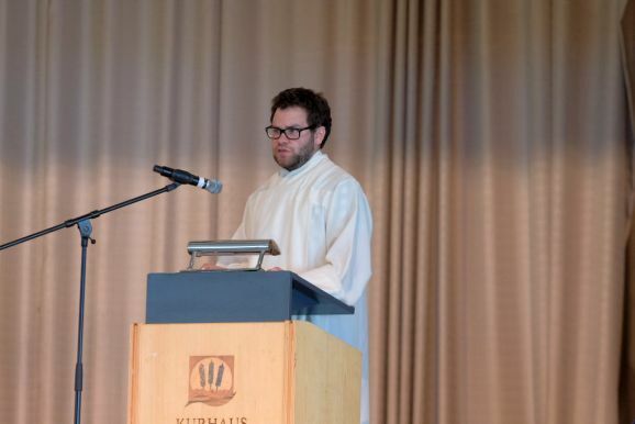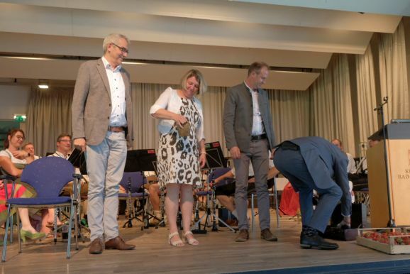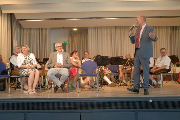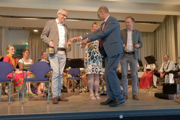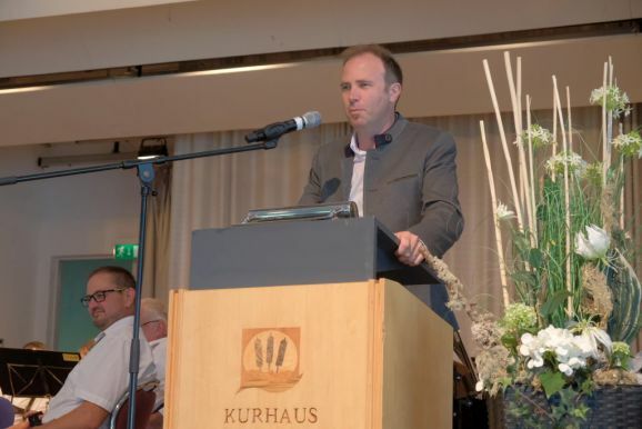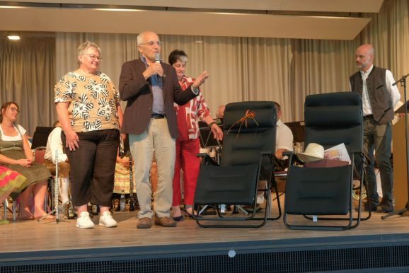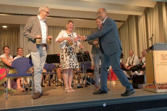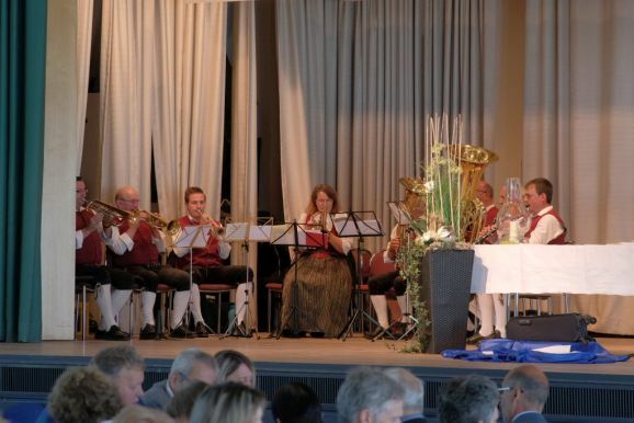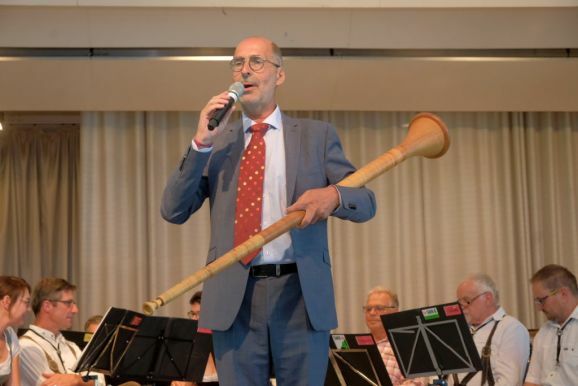 Mit einem Trick – alle Grußwortredner blieben auf der Bühne – überrumpelte Bitterwolf diese und so machte er sie gleich zu einem Teil der Bühnenshow: Mit diversen Kuhglocken spielten sie nach seinem Dirigat die Melodie von Amazing Grace – und das nicht schlecht.