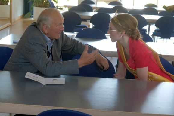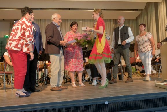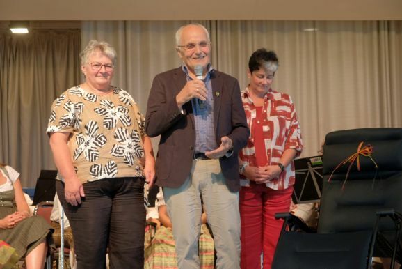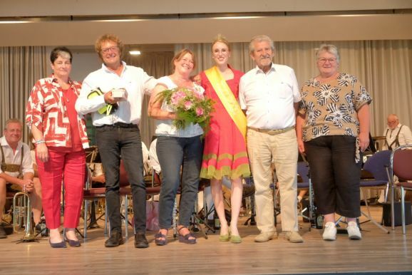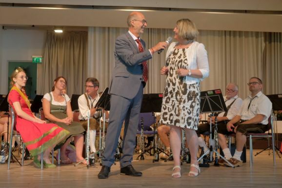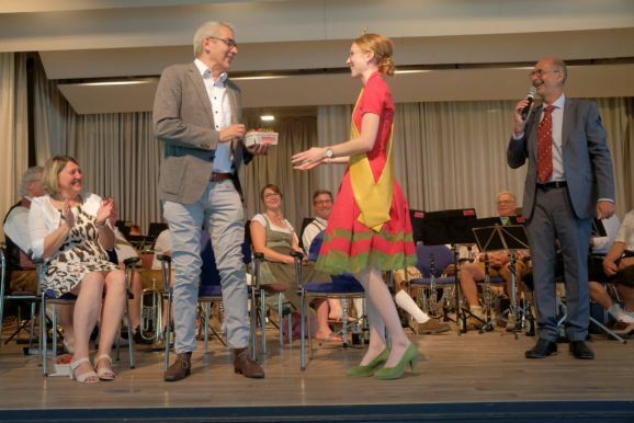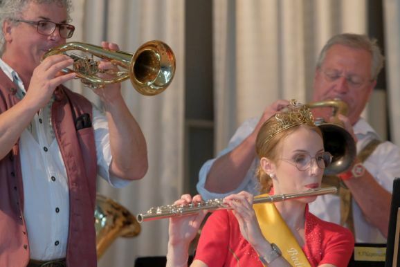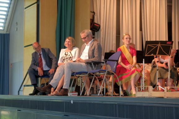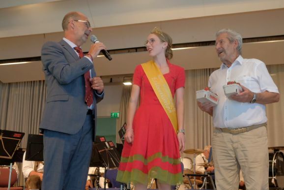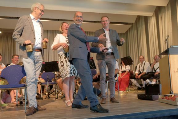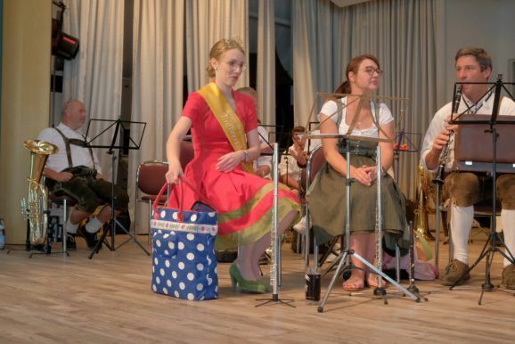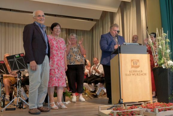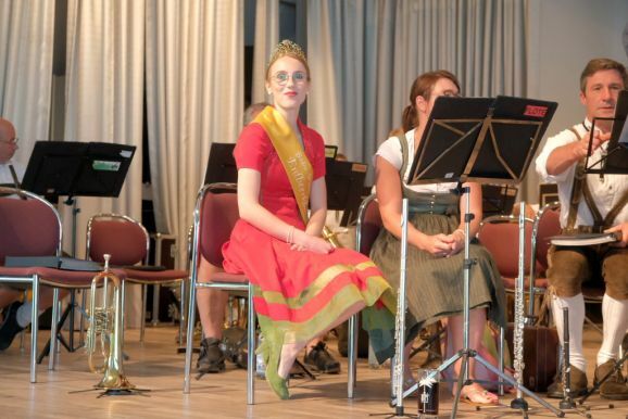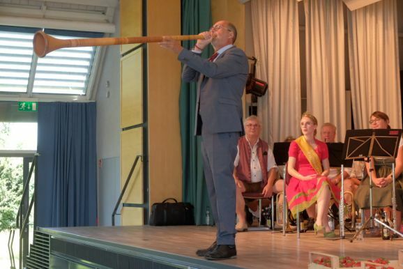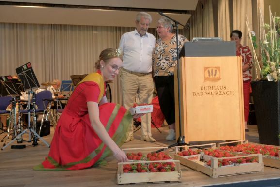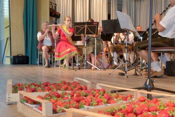 Auch ein gekröntes Haupt war unter den Gästen: Tamara Sauter, seit diesem März die Baden-Württembergische Erdbeerkönigin war gleich in mehrfacher Funktion dabei: Als Musikerin nahm sie auf der Bühne Platz und spielte bei der Bauernkapelle Querflöte, als Königin der süßen Früchte verteilte sie selbige an die Ehrengäste. Und nicht zu vergessen: Moderator und Entertainer Barny Bitterwolf, der sich gleich prächtig einführte: Der Schwäbische Gruß, „Grüß Gott ihr liaben Leit“ sei allumfassender als jedes Gendersternchen und schon immer seiner Zeit voraus gewesen und machte gleich klar, wie der Tag laufen sollte:„Freide heit, susch hosch morga a uagnehms geschdern!“