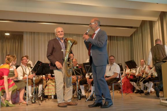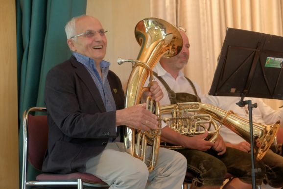 Und auch Franz Schönberger konnte sich nur lobend über Frick äußern: „Er war ein super Ausbilder.“ Gerne erinnerte er sich auch an die familiäre Atmosphäre auf dem Frick-Hof“ zurück. Und weil Hans Frick noch immer ein leidenschaftlicher Musiker ist, durfte er sich einen Titel von der Bauerkapelle wünschen und mit seinem Tenorhorn selbst mitspielen.