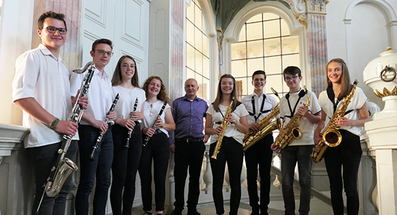 Die von Georg Stankalla – Klarinettist, Komponist und Lehrer an der JMS Bad Wurzach – ausgewählte Sitzordnung unterstrich noch zusätzlich den Concertato-Stil, also den Kontrast zwischen gegensätzlichen Stimmen bzw. Gruppen von Instrumenten: Links platzierte sich das Klarinetten-Ensemble, rechts waren die Saxophone zu sehen und zu hören.