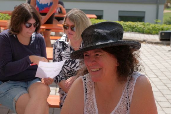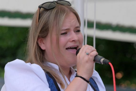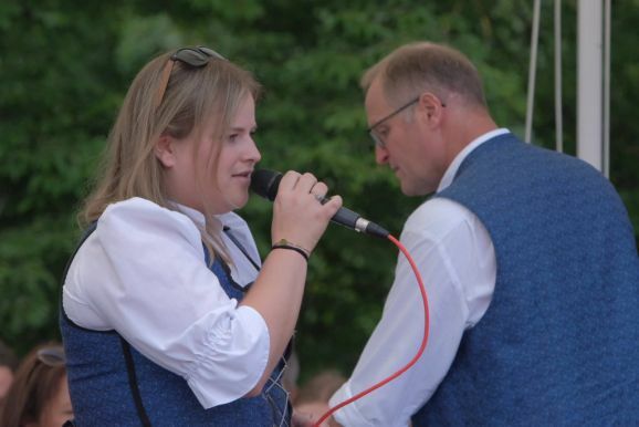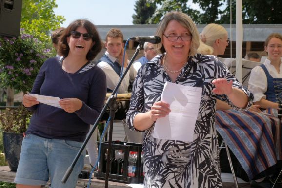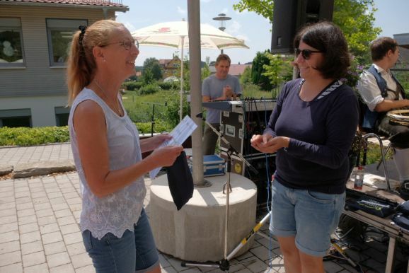 Eröffnet wurde der Arnacher Festtag mit einem Familiengottesdienst im Schulhof, zelebriert bei schönstem Hochsommerwetter durch Vikar Manuel Hammer. So gut wie alle Plätze waren belegt, auf der Straße vor dem Schulhof reihte sich Rad an Rad. Das Jugendgottesdienstteam eröffnete den Gottesdienst mit dem Lied „Gott ist mit uns unterwegs“. Die Kinder hoben bei Stichworten aus dem kindgerechten Lied entsprechende Plakate. Das Lied wurde von Carola Haselhofer mit der Cajon, einer Kistentrommel, begleitet.