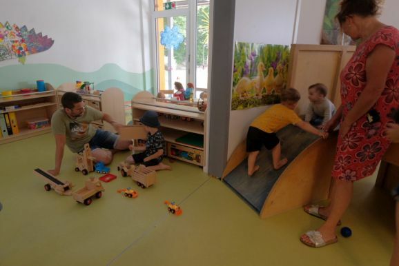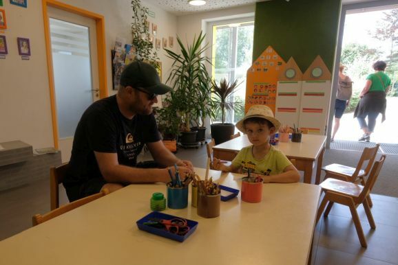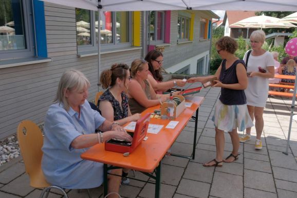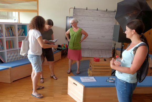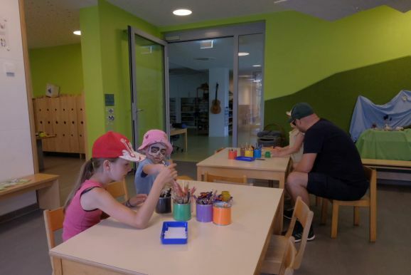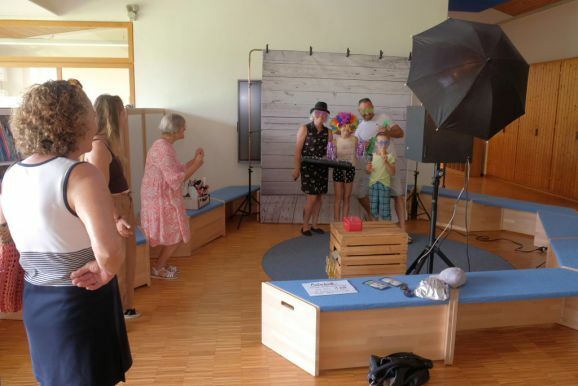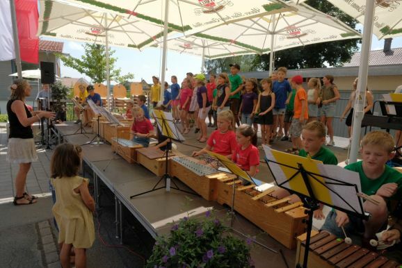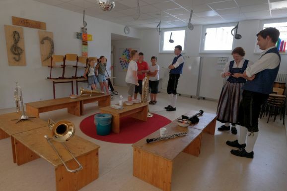 Im Rahmen des Tags der offenen Tür in der Schule konnten Kinder auch unter Anleitung junger Musiker des Musikvereines einfach mal Instrumente ausprobieren. Auf dem Sport- und Spielplatz hinter dem Bildungshaus lockte eine Spielstraße, im „alten“ Kindergarten konnten sich ganze Familien oder Einzelpersonen in diversen Verkleidungen ablichten lassen. Der Erlös wird dem Spielplatz zugutekommen. In den Räumen der Grundschule konnten die Kinder (und Erwachsenen) sich in die Kunst des Papierschöpfens einweisen lassen, im (kühlen) Untergeschoss des Kindergartens konnten die Kids sich eigene Button entwerfen.