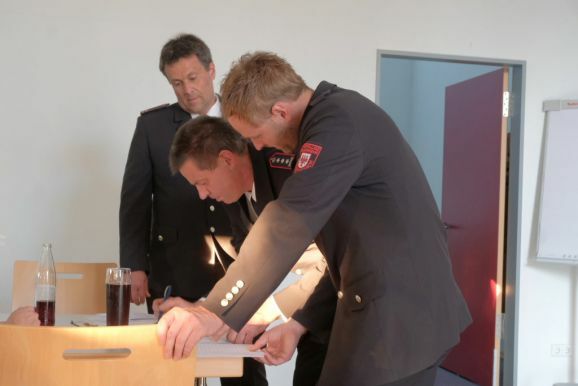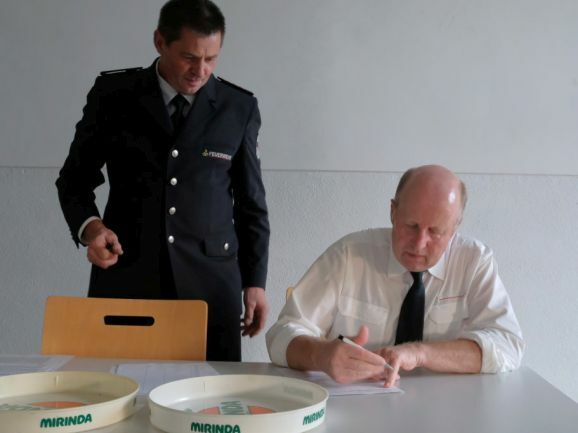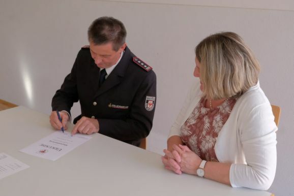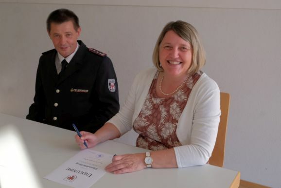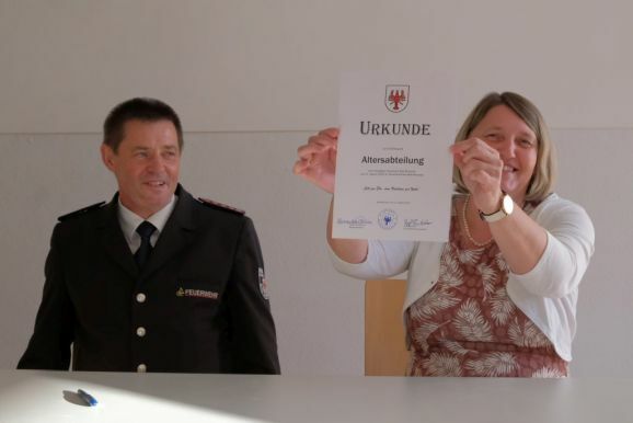 Gemeinsam mit Kommandant Rolf Butscher unterschrieb die Bürgermeisterin danach die Gründungsurkunde der Altersabteilung, ein formaler Schritt für die Akten, wie sie es ausdrückte.
