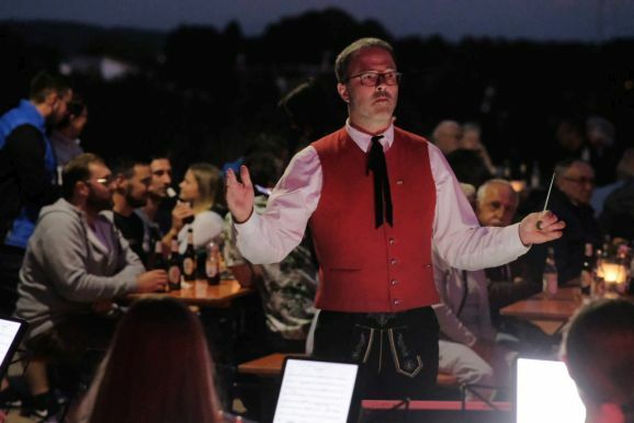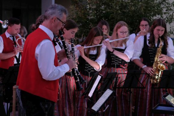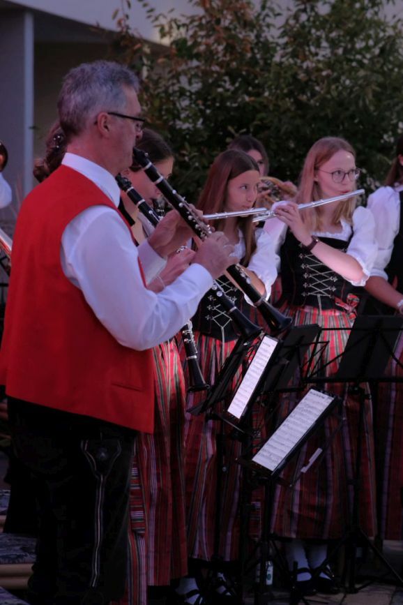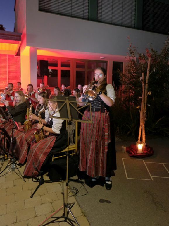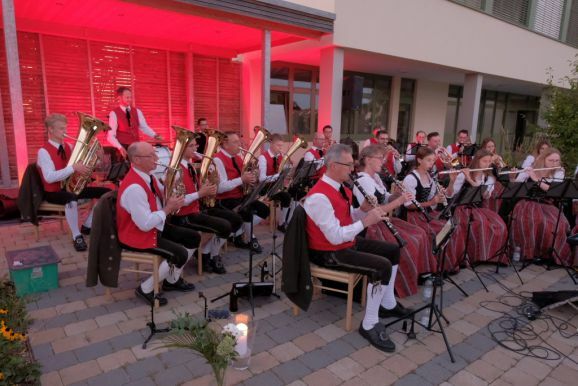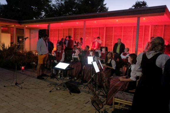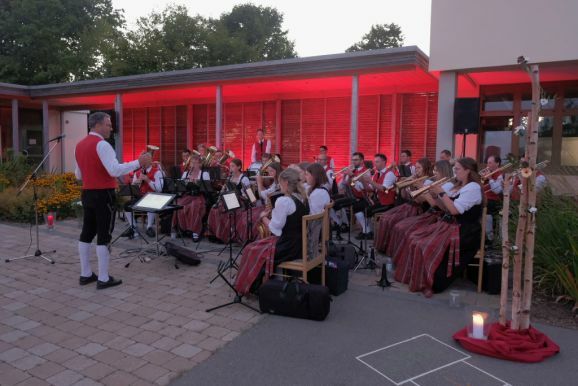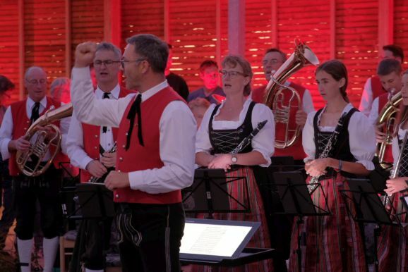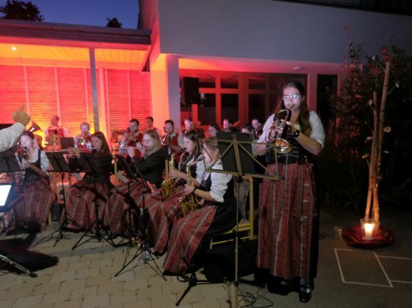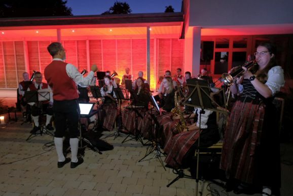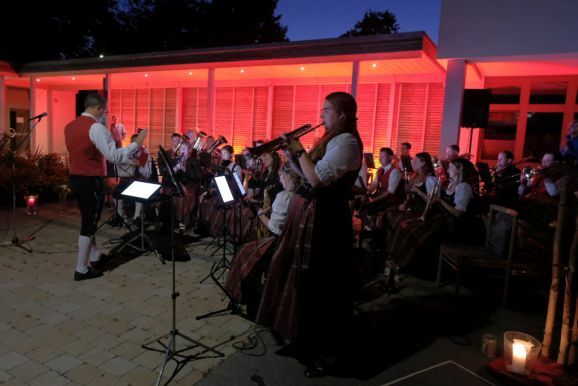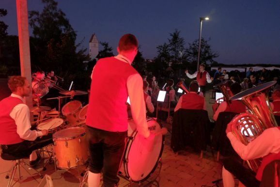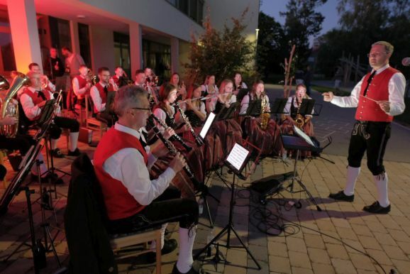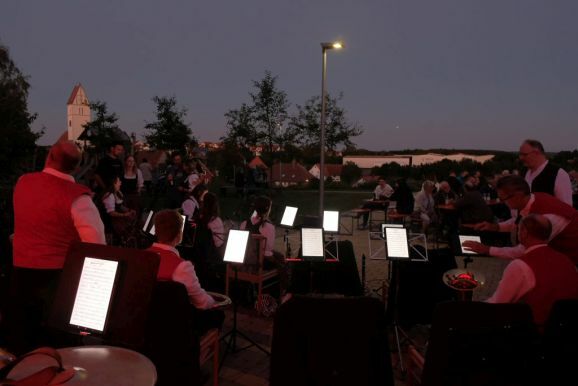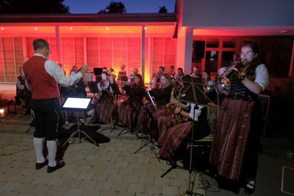 Dirigent Bernd Butscher hatte für den Dämmerschoppen neben den vielgespielten Klassikern wie Böhmischer Traum, Dem Land Tirol die Treue oder Ewig Schad seinen MusikerInnen auch einige Stücke aufs Tablet geladen, die z.T. erst in den vergangenen beiden Jahren herausgekommen sind und bisher nur von wenigen Kapellen gespielt wurden, etwa Der Märchenkönig, Bergliebe oder Meine Heimat bist nur Du. War die hereineinbrechende Nacht vor einem Jahr noch ein Problem für die Musiker, so konnten sie jetzt problemlos eine Stunde länger spielen...