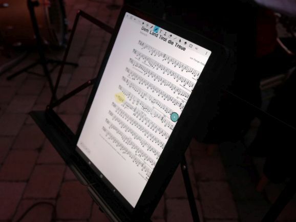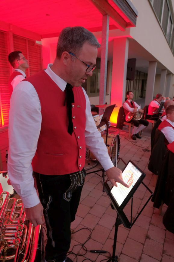 Beim Dämmerschoppen, der bereits vor einem Jahr ein großer Erfolg war, ging es jetzt an die Umsetzung: Alle Musiker hatten auf ihren Notenständern Tablets und angeleitet von ihrem Dirigenten Bernd Butscher, der schon längere Zeit mit Tablet arbeitet, bot die Musikkapelle neben der gewohnt hohen musikalischen Qualität auch bei der hereinbrechenden Dunkelheit mit den leuchtenden Displays ein imposantes Bild. Natürlich waren auch viele Musiker anderer Musikkapellen zum diesjährigen Dämmerschoppen gekommen, hauptsächlich um den Eggmannsriedern bei ihrer „Arbeit“ über die Schulter zu schauen und sie in den Pausen mit Fragen zu löchern.