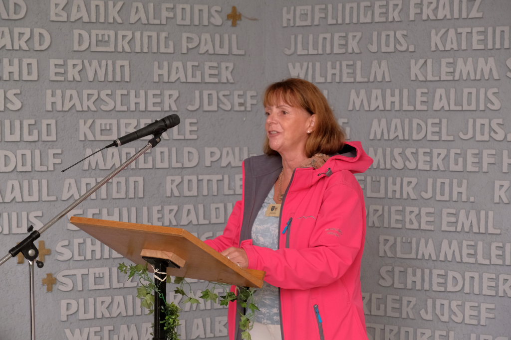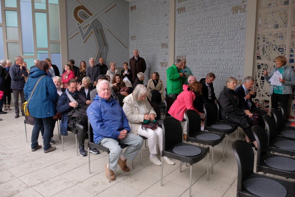 Judy King, Tochter eines der ehemaligen Internierten, verlas Friedensgedichte von zwei jungen Betroffenen aktueller Kriege: Hakim Karwan (21) aus Afganistan „If peace comes“ und Shahed Zeitoon (16) aus Syrien „I feel robbed of my Childhood by conflict“.