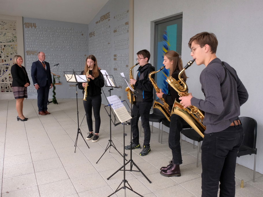 Begleitet von einem Musikstück des Bläserquartetts verharrten die beiden Bürgermeister bei der Kranzniederlegung gemeinsam mit den Gästen in stillem Gedenken an die verstorbenen Internierten.