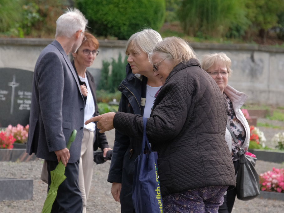 Bad Wurzach - Nach dem Gedenkgottesdienst in der Schlosskapelle führte der Weg der Delegation aus Jersey und seiner Bad Wurzacher Gastgeber hinauf zum Friedhof, um an der Aussegnungshalle mit einer Kranzniederlegung und Gedichten der verstorbenen Internierten zu gedenken.