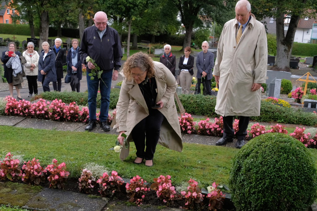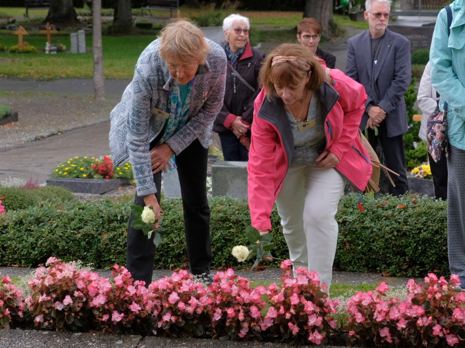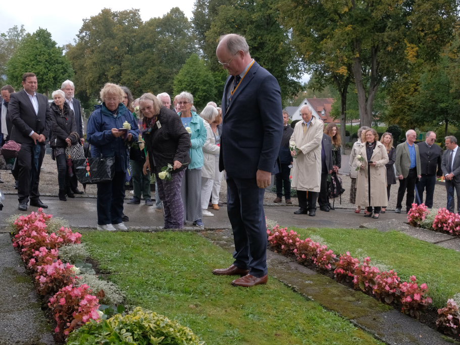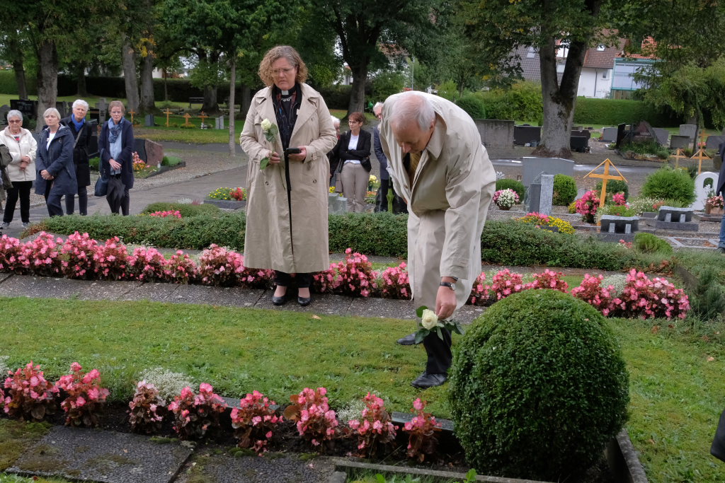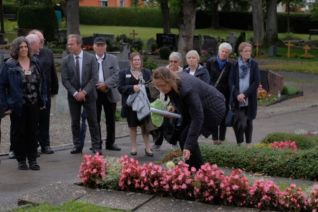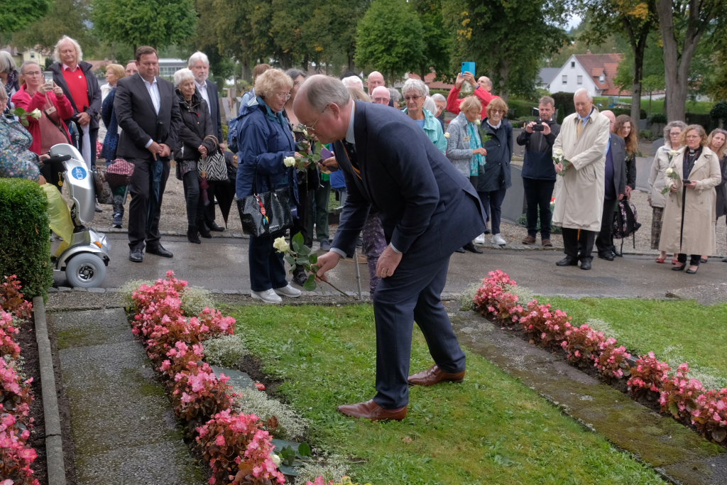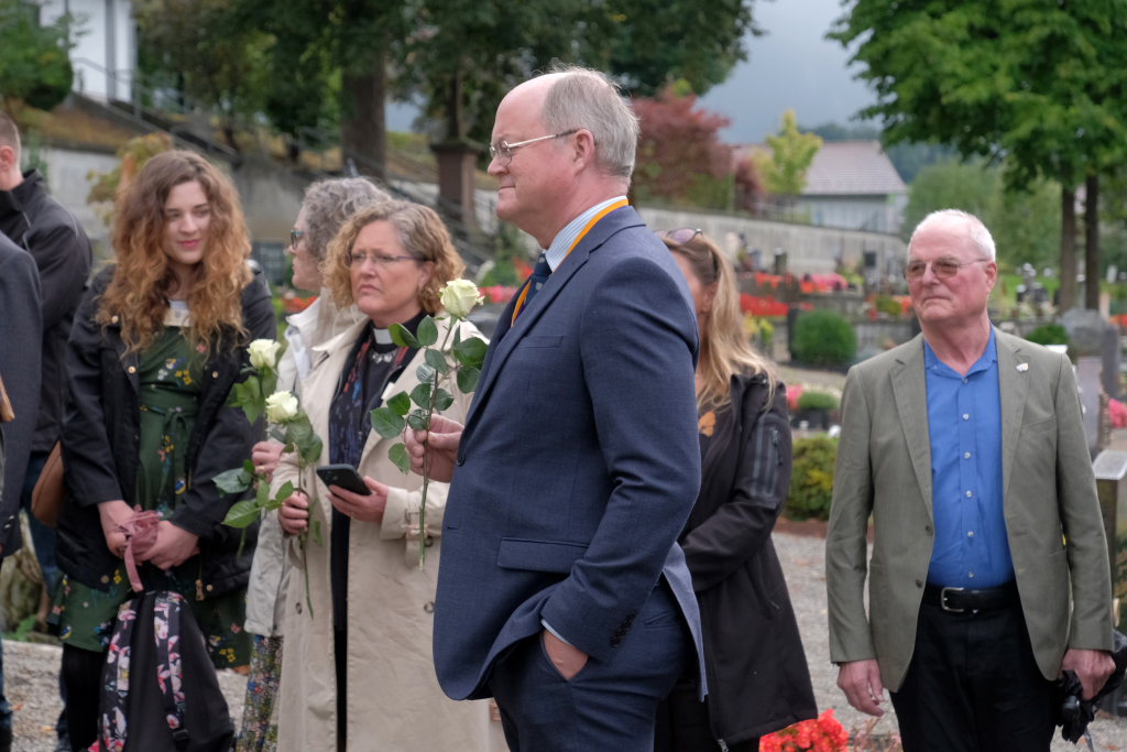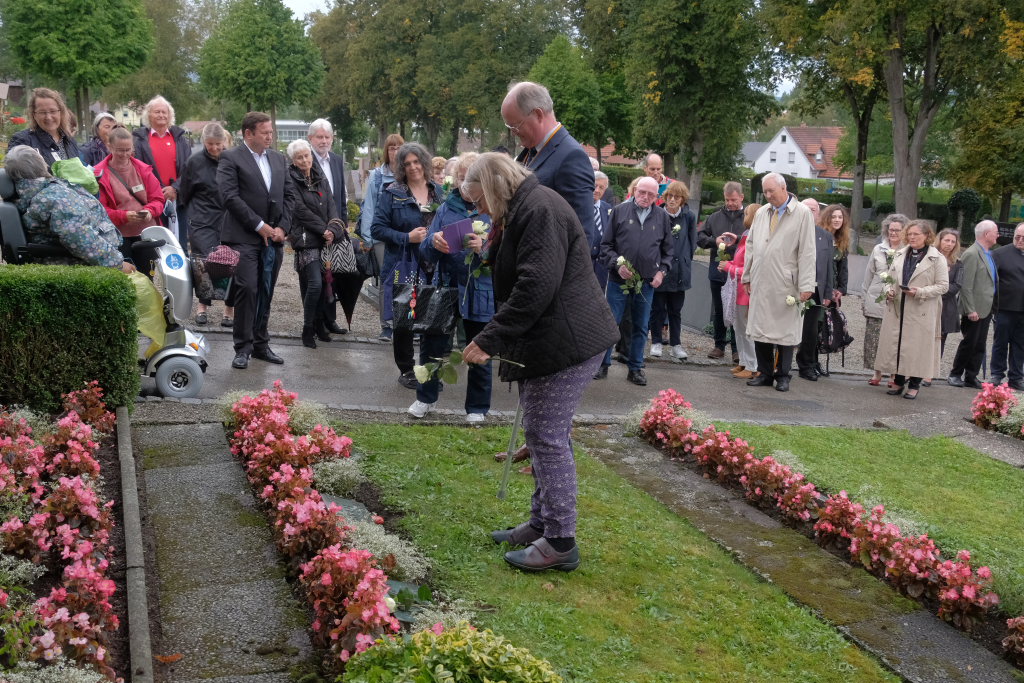 Nach dem St. Anthony Choral von Joseph Haydn ging es zu den Gräbern der in Wurzach verstorbenen Internierten, wo Scherer und Crowcroft sowie die ehemaligen Internierten bzw. ihre Angehörigen jeweils eine weiße Rose auf den Gräbern ablegten, ehe Reverend Sarah McClalland mit dem Segen die Gedenkfeier beendete.