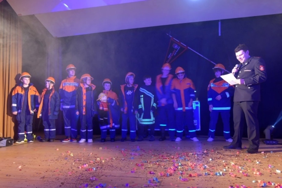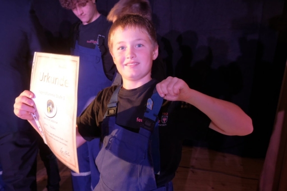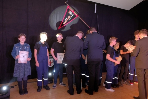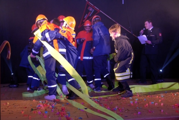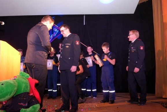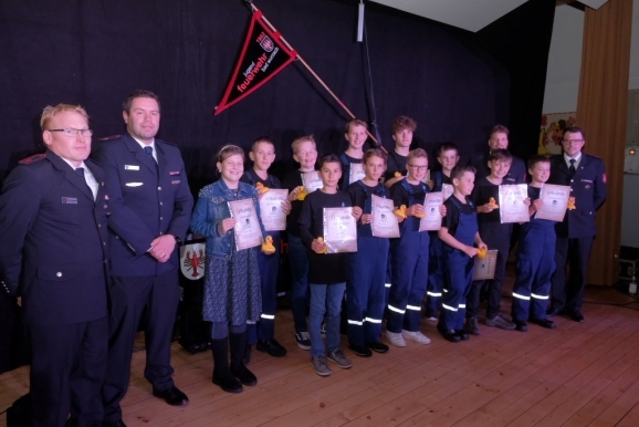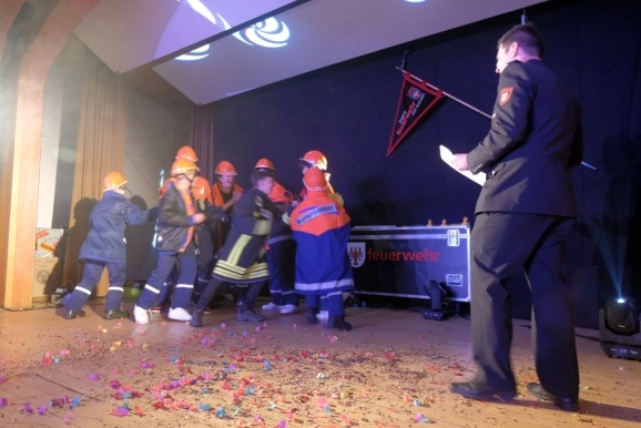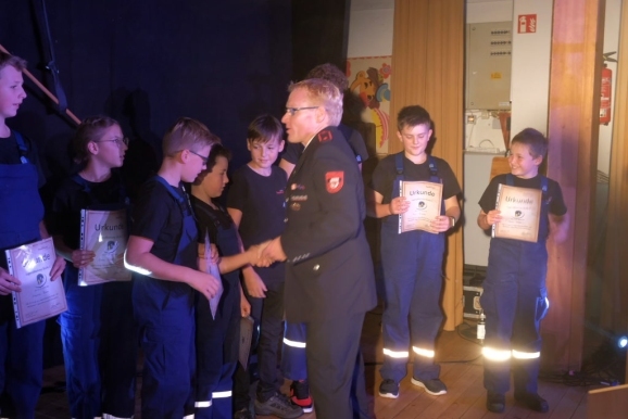Stefan Schimske, stellvertretender Kreisjugendfeuerwehrwart, zählt den Bad Wurzacher Nachwuchs zu einer festen Größe im Kreis. „Die Quote von 80% ist eine starke Zahl. Die Frage ist, wie sehe es aus wenn es die Jugendfeuerwehr nicht gäbe?“ Er wisse, dass Jugendarbeit nicht immer einfach sei. Daher sei es wichtig, dass die Betreuer da seien, wenn es mal Probleme gebe. Er freute sich daher Pascal Schmehl die silberne Ehrennadel der baden-württembergischen Jugendfeuerwehr anheften zu dürfen. Im Anschluss wurden den Jugendlichen, die in diesem Jahr dazugekommen waren, die mit der Jugendflamme die erste Prüfungsurkunde überreicht. Großen Spaß an ihrem Tun hatten die Nachwuchsfeuerwehrleute bei ihrer anschließenden Vorführung die eine nicht ganz ernstgemeinten Chaos–Feuerwehrprobe zeigte und die ihren Leiter Marius Nägele, trotz seiner häufigen Ermahnung: „Disziplin!!!“ so richtig zur Verzweiflung trieben.