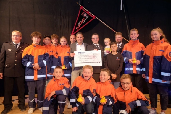 Durch den Verkauf von 895 Entchen hatten die rührigen Nachwuchsfeuerwehrleute 1.795 € beim diesjährigen Stadtfest eingenommen. Und weil in diesem Jahr das Jubiläum anstand, stockte die Bank den Betrag zugunsten der Jugendfeuerwehrkasse auf glatt 2.500 € auf. Damit konnte Pascal Schmehl einen großen Scheck in Empfang nehmen. Schmehl nannte auch den Verwendungszeck: „Durch Corona hat unsere Kasse etwas geschwächelt. Wir sind daher froh, dank diesen Geldes beim Jugendlager des Kreisfeuerwehrnachwuchses teilnehmen zu können.“ Er glaube dass das Geld dafür gut angelegt sei.