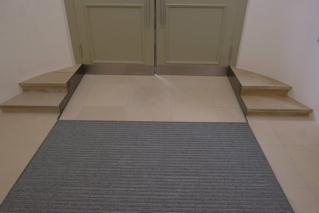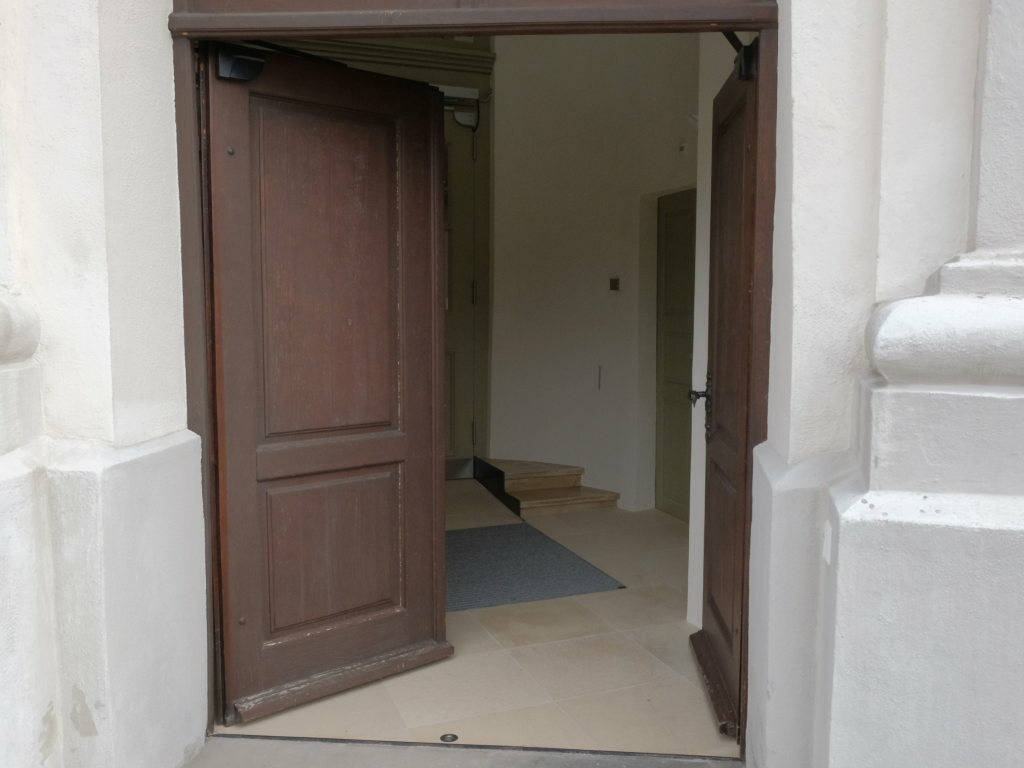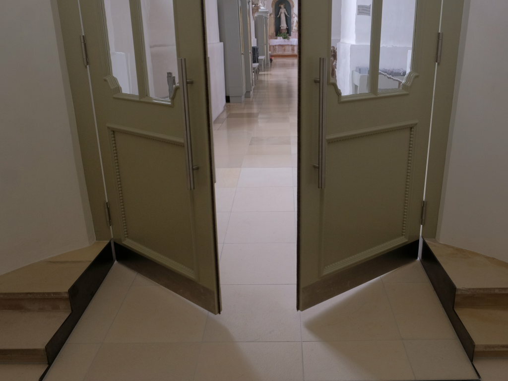 In langwierigen Abstimmungsgesprächen mit dem Landesdenk-malamt und dem Bischöflichen Ordinariat einigten sich die Beteiligten auf die denkmalverträglichste Lösung, die eine Rampe mit automatischen Türöffnern und den Erhalt der Türen im Windfang ermöglichten.