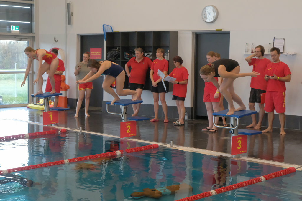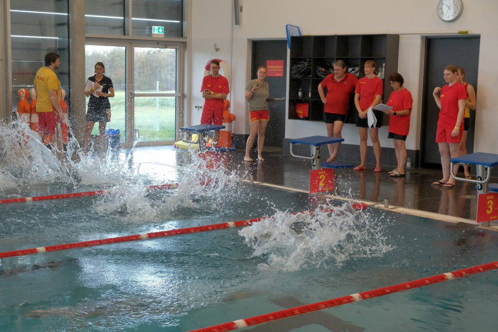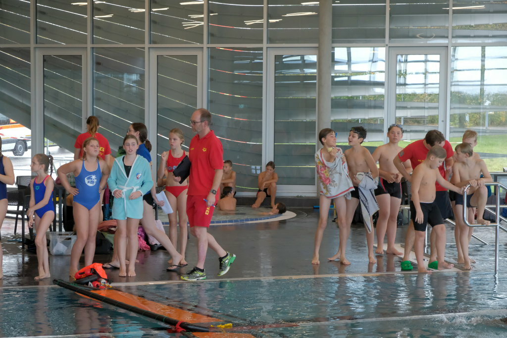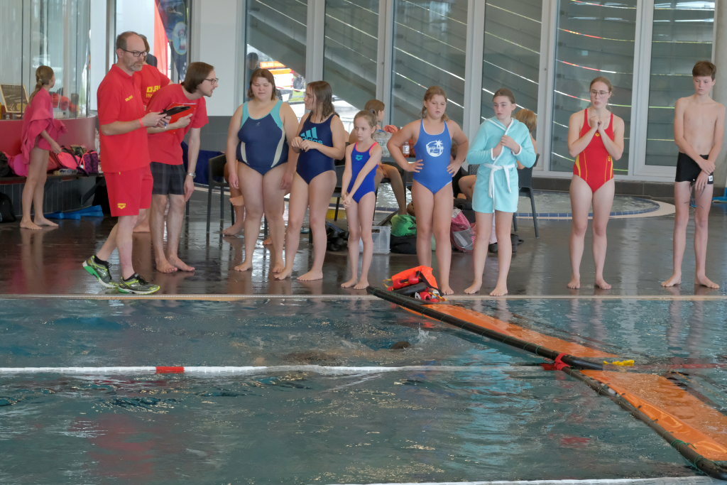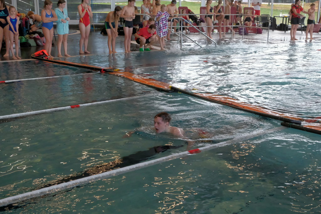 Weitere Altersklassen am Start waren die 15/16jährigen, die 17/18jährigen und die Erwachsenenklasse, jeweils männlich und weiblich. Die Starter mussten verschiedene Disziplinen absolvieren und wurden nach Zeit in einem Punktesystem bewertet. „Für die Mannschaftsstaffel am Nachmittag haben wir im Vorfeld geübt.“ Das sei wichtig gewesen „zum Reinfinden“ weil es ja drei Jahre lang keine Möglichkeit gegeben hatte. Und auch für den Organisationsleiter und seine junge Truppe, der im Vorjahr erst sein Amt als Vorsitzender der DLRG Ortsgruppe angetreten hatte, war die Ausrichtung dieses Wettkampfes eine Standortbestimmung.