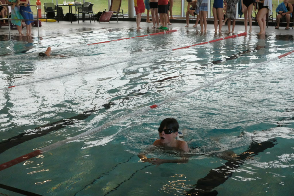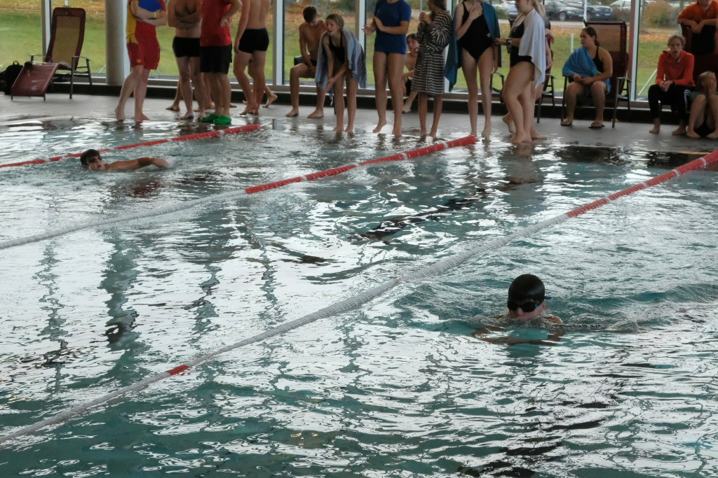 „Das ist heute ein neuer Besucherrekord für das neue Hallenbad,“ witzelte Manuel Pfender, angesichts des ohrenbetäubenden Lärmes, mit dem die Mannschaftskollegen ihre gerade schwimmenden Kameraden anfeuerten.