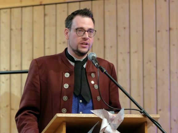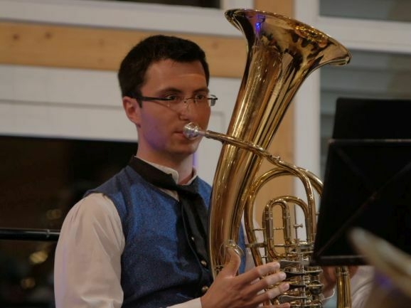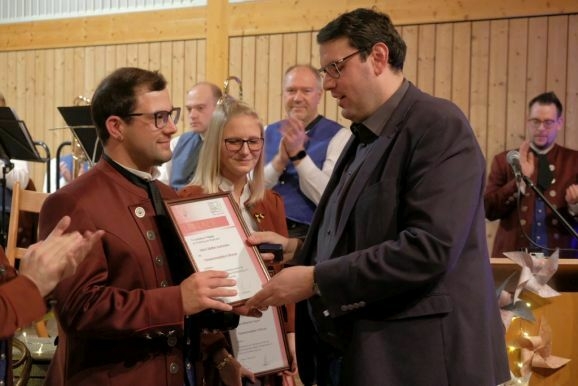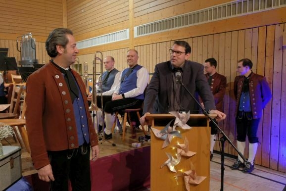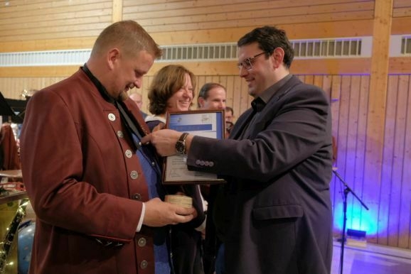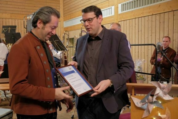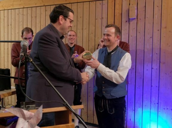 Damit Alexander Werner noch ein wenig Statur gewinnen möge, hatte er wie für die zu ehrenden Tubisten – an diesem Abend Daniel Rold – ein besonderes Schmankerl mitgebracht: Eine Dose Wurst aus der Klostermetzgerei Reute.