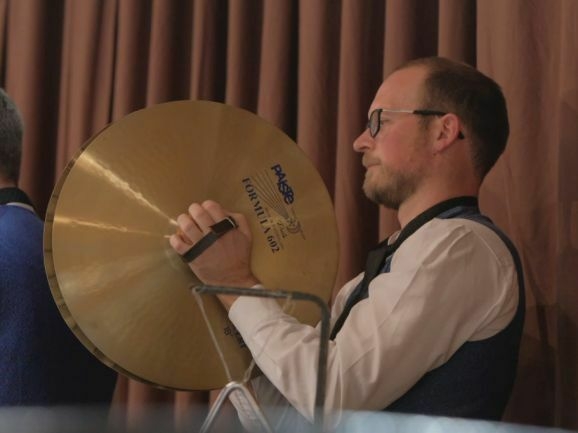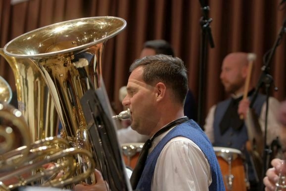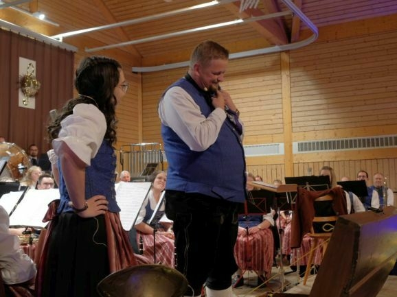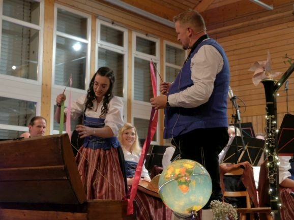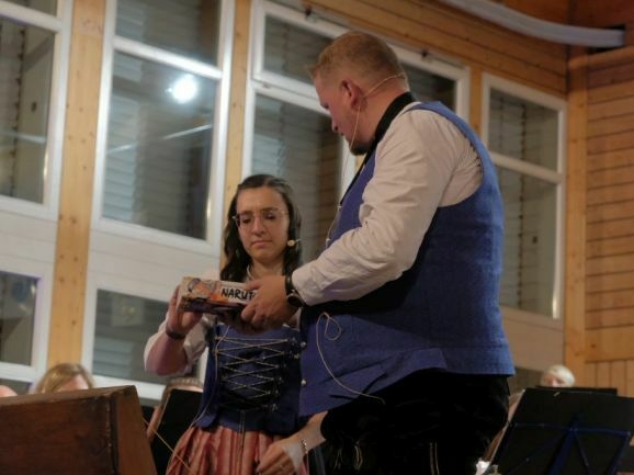 Bevor das Konzert mit Philip Sparke´s „A Klezmer Karnival“ fortgesetzt wurde, traten die beiden Ansager Anna-Lena Feser und Daniel Rold alias Inge und Hans erstmals auf den Plan, um die große braune Truhe auf der Bühne zu durchforsten – nein nicht nach materiellen Schätzen, sondern um viele Erinnerungen wieder aufzufrischen – etwa mit dem Halstuch, das Hans von der schönen Katharina aus der Karneval Gruppe aus Ungarn zum Abschied bekommen hatte. Diese Gruppen hatten in Ungarn früher in allen Kneipen zum Klezmer Karneval musiziert. Sparke beschreibt in diesem Stück genau jene Musik, die mal lustig und auch mal melancholisch daherkommt.