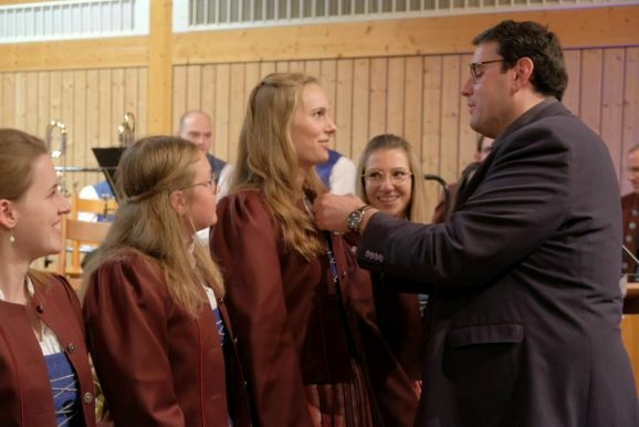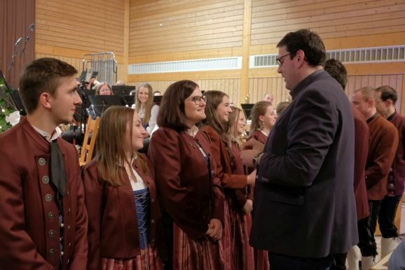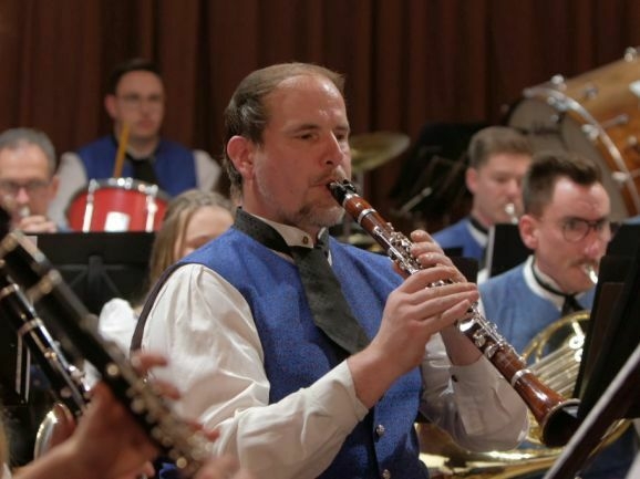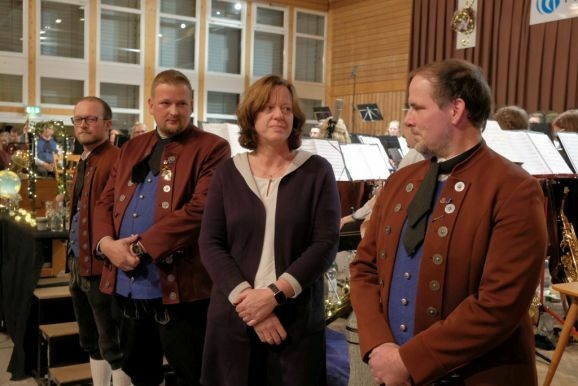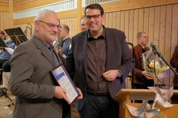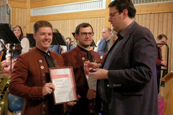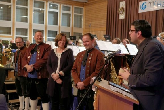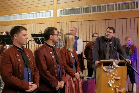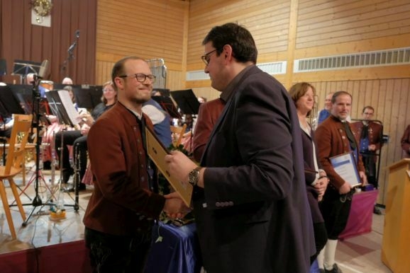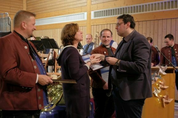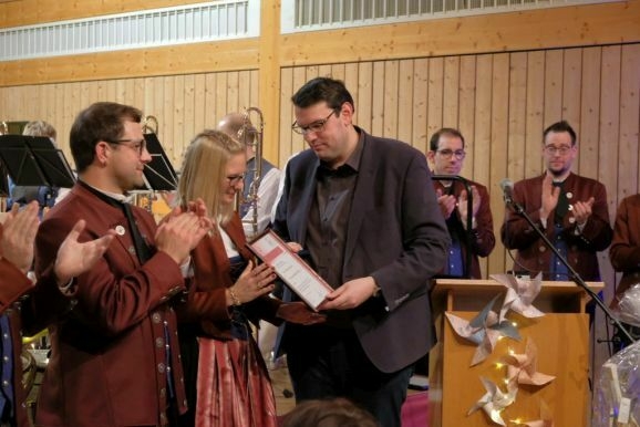 Mit Freuden war Klaus Wachter wieder in seine ehemalige musikalische Heimat zurückgekehrt, um viele von ihnen für insgesamt 495 Jahre aktive Tätigkeit für die Musikkapelle im Namen des Kreis- und Württembergischen Musikverbandes zu ehren. „Es ist für mich das Highlight der diesjährigen Ehrungssaison,“ sagte er und fügte hinzu: „Es ist mir eine Freude, zu sehen, dass die musikalischen Früchte meiner Arbeit der letzten 10 Jahre in so hervorragender Weise weitergetragen werden.“ Als er angefangen habe, saßen 42 Musiker auf der Bühne, jetzt an diesem Abend fast 70. Er freute sich auch, dass mit Alexander Demmler und Michaela Willburger alle Dirigenten der letzten 25 Jahre sich aktiv an dem Konzert beteiligten.