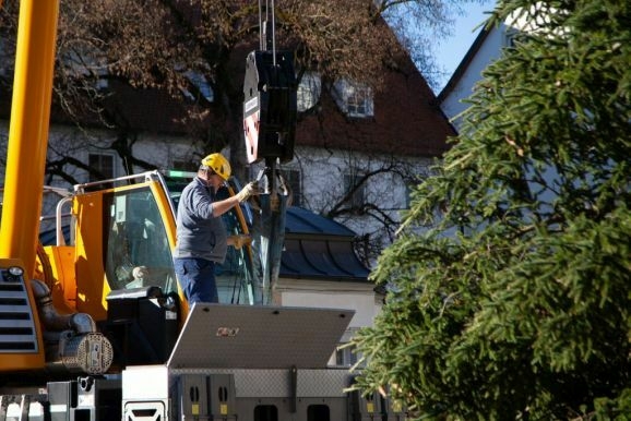 Rund 15 Meter hoch, viereinhalb Tonnen schwer das sind die „technischen Daten“ der Fichte, der die Bauhofmitarbeiter seit Mittwoch früh 9.00 Uhr mit ihren Kettensägen und Autokran zu Leibe rückten und die nun in den nächsten sechs Wochen ein wenig Lichterglanz in die dunkle Jahreszeit bringen wird. Was Bürgermeisterin Alexandra Scherer, die beim Aufstellen des Baumes sozusagen einen Logenplatz hatte, sehr wichtig ist. „Darauf wollen wir trotz der schwierigen Zeit nicht verzichten.“