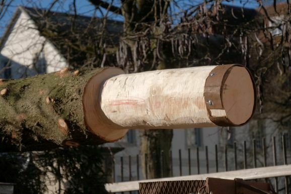 Das eigentliche Aufstellen war dank der guten Vorarbeit bereits beim Fällen – der Stamm war bereits exakt auf den Durchmesser der 3 Meter hohen Metallröhre gestutzt, in die der Stamm aus Sicherheits- und Stabilitätsgründen gesteckt wurde, rasch erledigt worden.