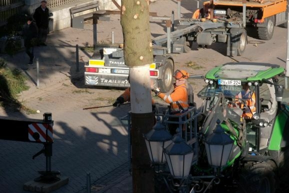Auch der diesjährige Christbaum ist wegen seines ausladenden Geästes wieder etwas ganz besonderes. Gerade deswegen war es für Bauhofleiter Dirk Fietkau der nervenaufreibendste Teil der Aktion Christbaumstellen als sich der Tross mit Polizei, Autokran samt Materialbegleitfahrzeug, sowie den Bauhoffahrzeugen rund um den Unimog in Richtung Stadtmitte in Bewegung setzte. Der Baum musste schließlich ohne diverse Laternen und Straßenschilder abzuräumen an seinen Bestimmungsort gebracht werden.