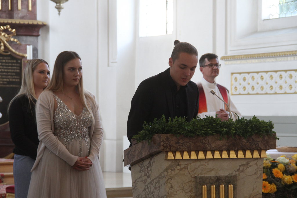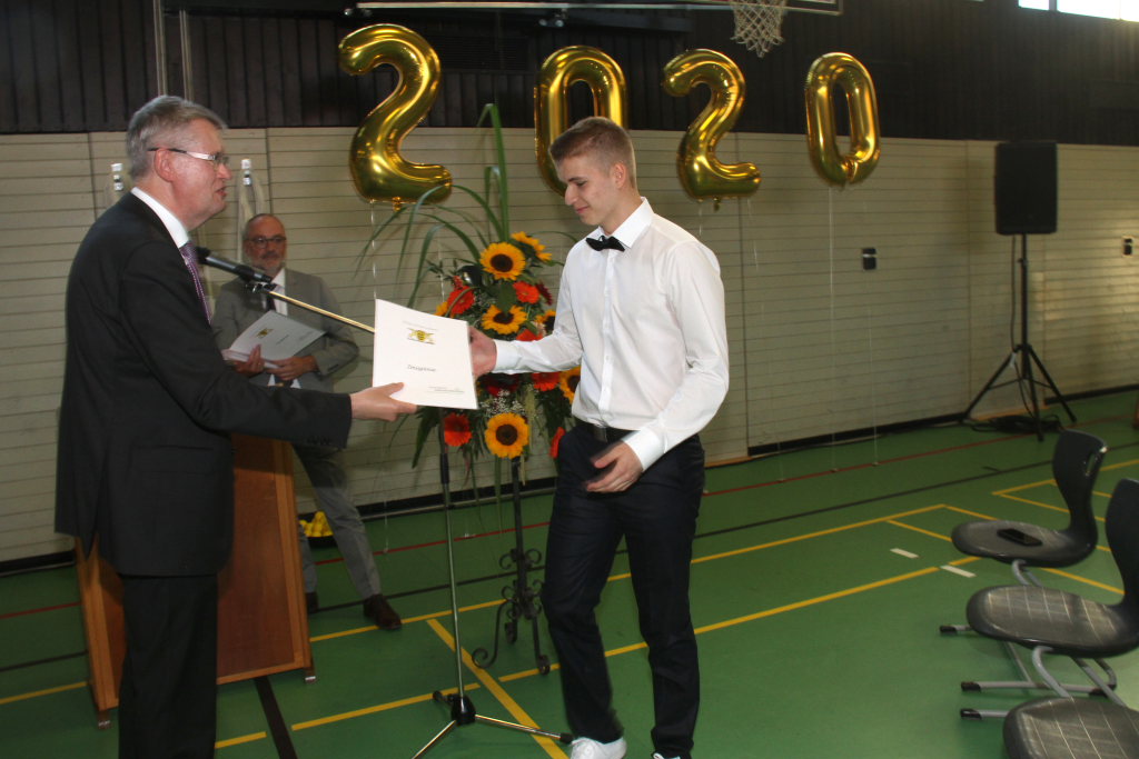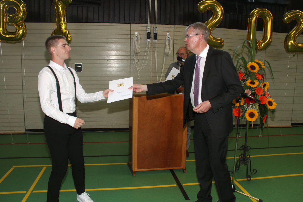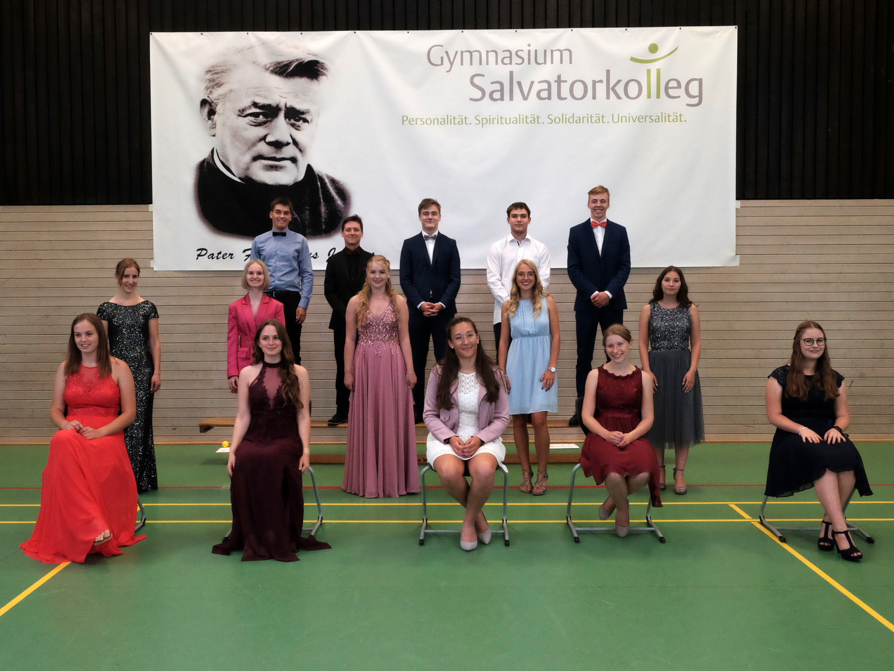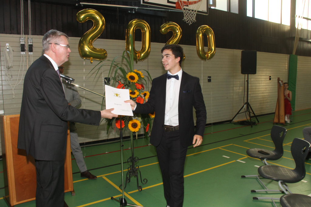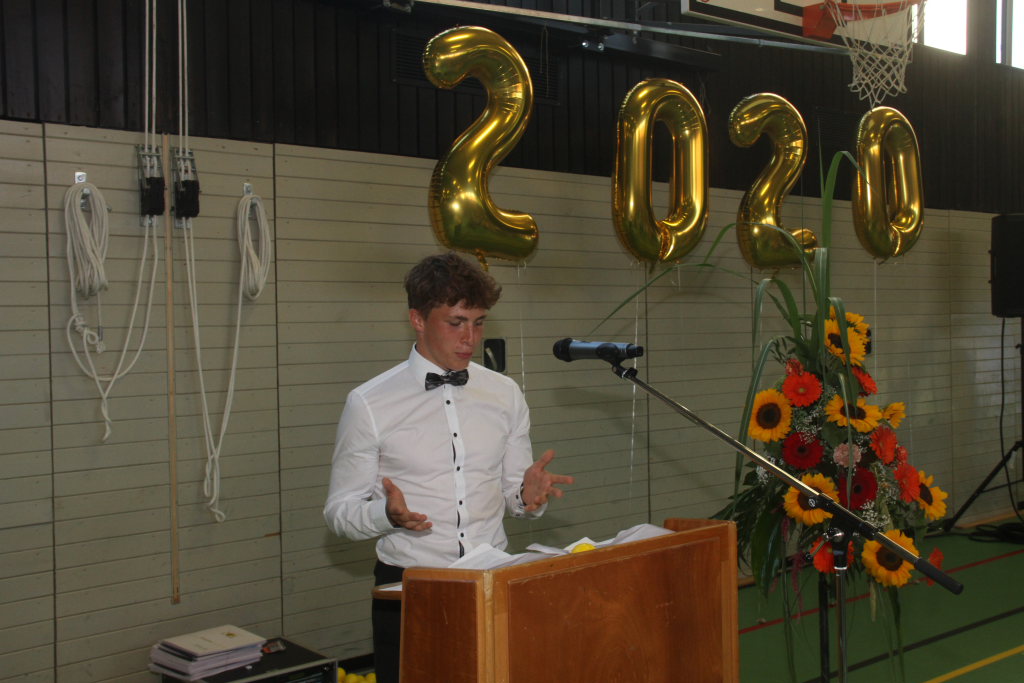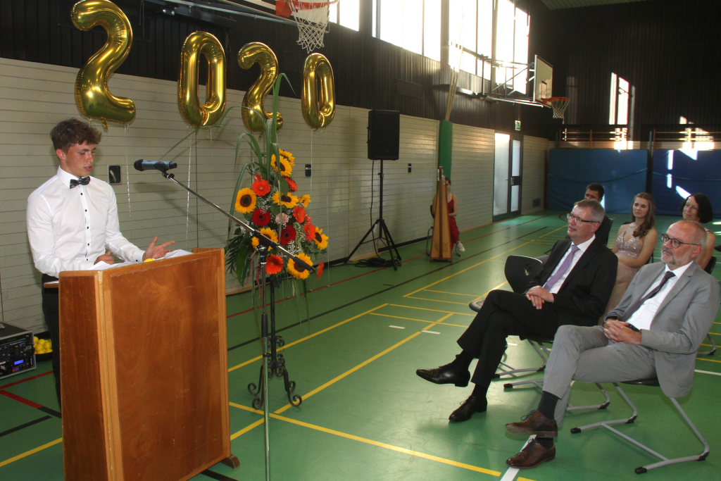 Lukas Bettrich wiederum schlüpfte noch einmal in die verschiedenen Rollen seiner Kollegszeit, berichtete von der Einschulungsfeier und wie die Kursstüfler grimmig geblickt hatten, weil sie in den Fluren herum getobt waren und Spaß gehabt hatten. „Und zack sind wir selber solche geworden.“ Er fragte sich auch, wem nach Corona gedankt werden müsse, dass es einen offiziellen Abschluss mit Zeugnisübergabe gebe: „Dem lieben Gott ? Oder Pater Friedrich? Das wäre eigentlich das gleiche...“ „Aber eigentlich ist heute ja doch nur die Abschlusskirsche auf die Sahnetorte Schulzeit.“ In der ihm eigenen flapsigen Art, dankte er wie die anderen beiden Schülervertreter Schulträger, Sekretariat und Hausmeister. Und natürlich Schulleiter Pater Friedrich: „Dass der Schulleiter die unbestrittene gute Seele der Schule war spricht Bände.“ Wenn man später zurückblicke und sagen könne: „Ich bin stolz darauf am Salvatorkolleg im Abiturjahrgang 2020 gewesen zu sein.“ Dann habe die Schule einen guten Dienst geleistet.