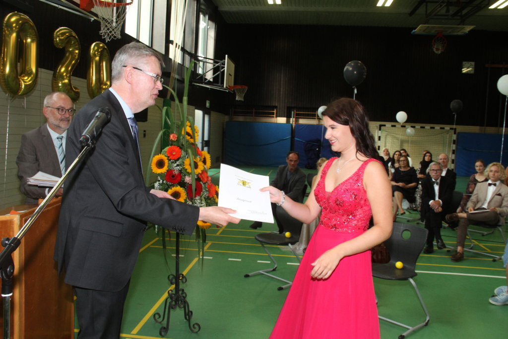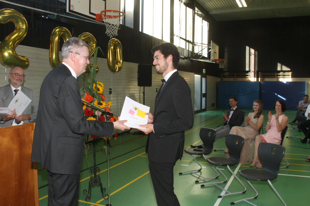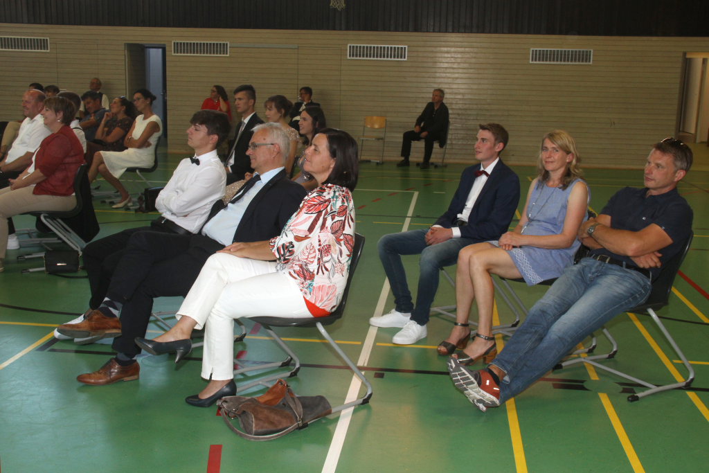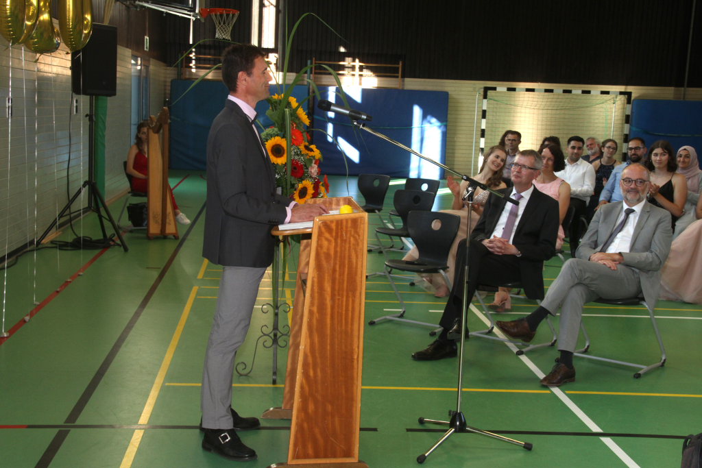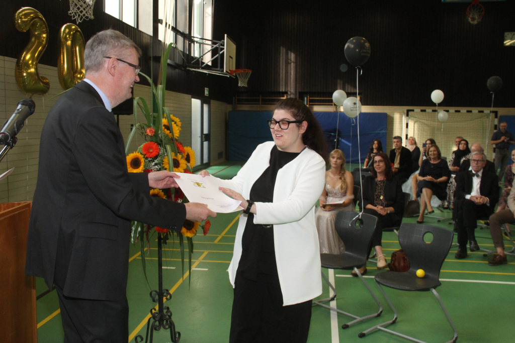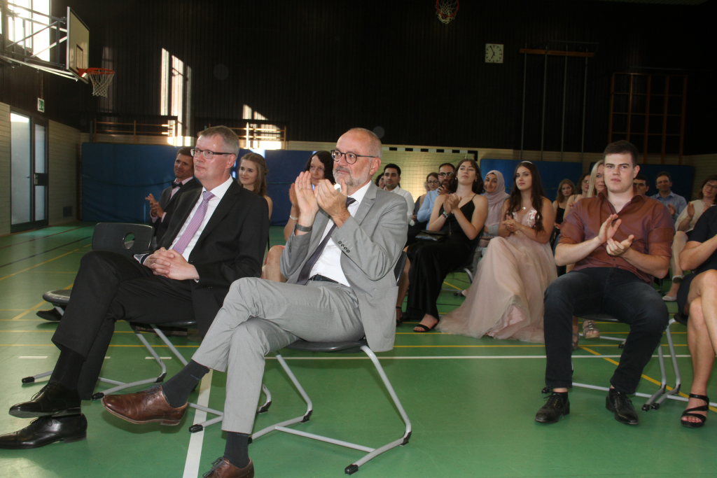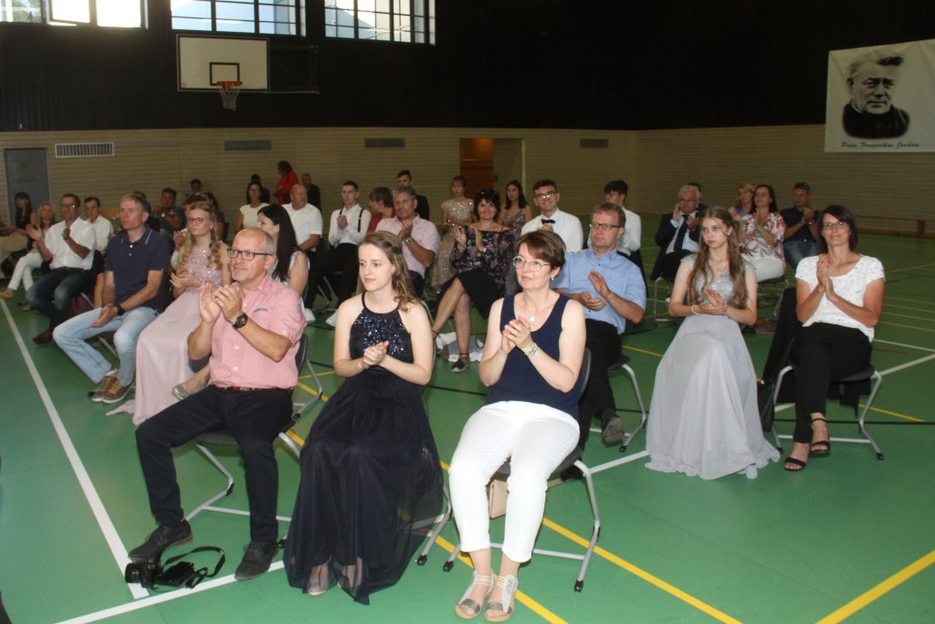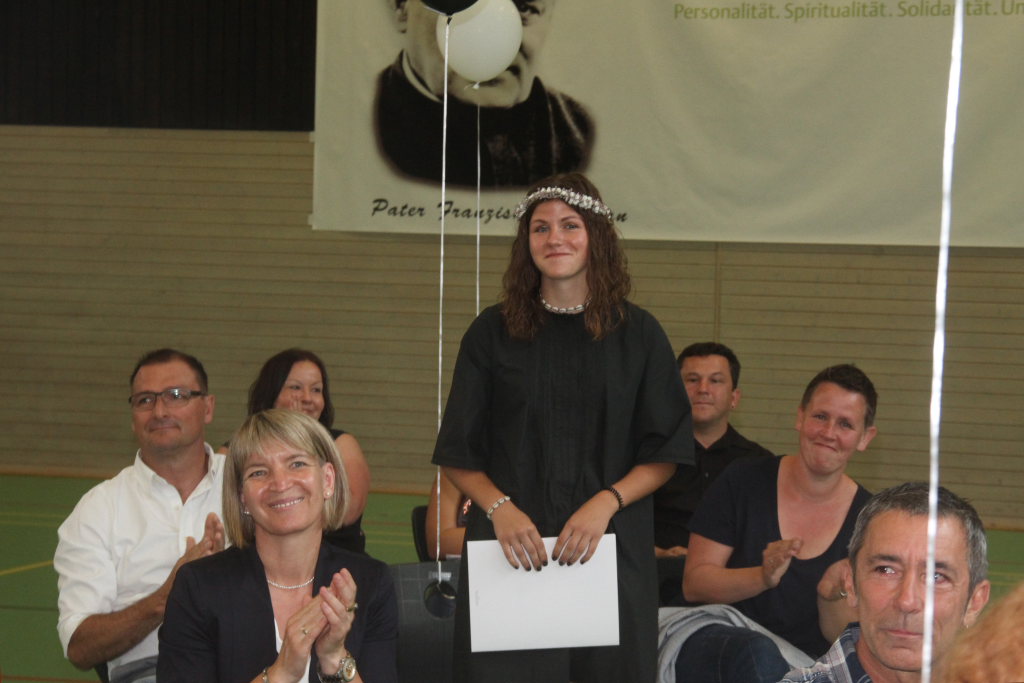 „Wir Eltern, haben uns alle Mühe gegeben und Euch die vergangenen Jahre begleitet, motiviert, mal getriezt, uns gefreut, aber auch gelitten, Daumen gedrückt, Fahrdienste gemacht und zum Dank habt ihr in der Pubertät uns und bestimmt auch manchen Lehrer zur Verzweiflung gebracht.“ Die Lehrer hätten sich dafür eingesetzt, die Persönlichkeit zu fördern und umfassend auf das Leben vorzubereiten, gemäß der Schulphilosophie: Personalität, Spiritualität, Solidarität und Universalität. „Habt den Mut Euch zu Verändern, habt keine Angst vor Fehlern, doch verliert nie den Glauben an Euch selbst“, machten sie den Abiturienten Mut für die Zukunft.