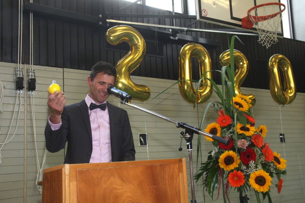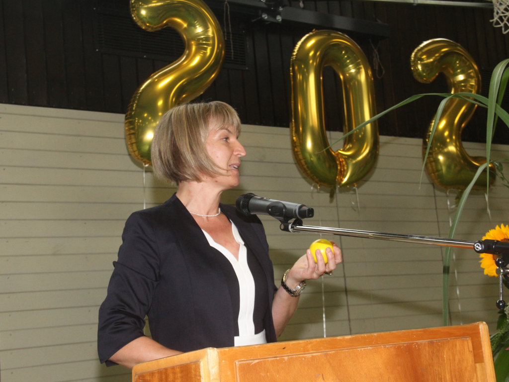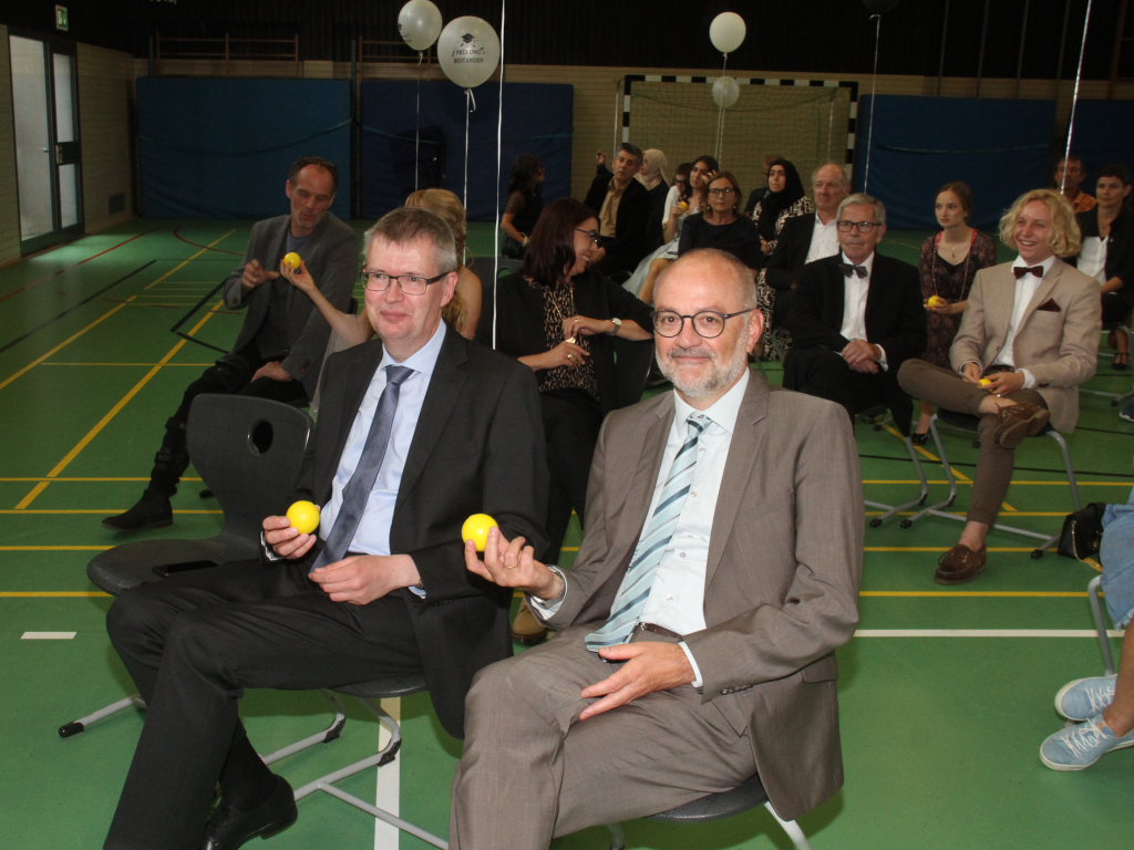 Als Vertreter des Elternbeirats verabschiedeten Andrea Ott und Helmut Zell die Abiturienten in ihren neuen Lebensabschnitt. Und weil diese in diesem Jahr auf einen großen Abiball verzichten mussten, bekam jeder Abiturient von den Elternvertretern seinen eigenen, gelben und knetbaren „Abiball“. Frei nach dem Lied „Übermorgen“ von Mark Forster ließen sie die Schulzeit ihrer Sprösslinge noch einmal Revue passieren. „Heute, morgen und übermorgen Guck, wie weit Ihrs schon geschafft habt.“