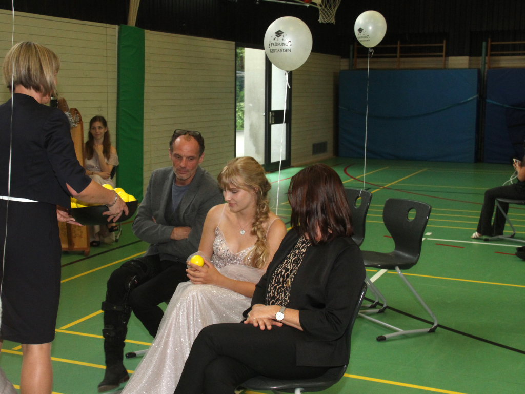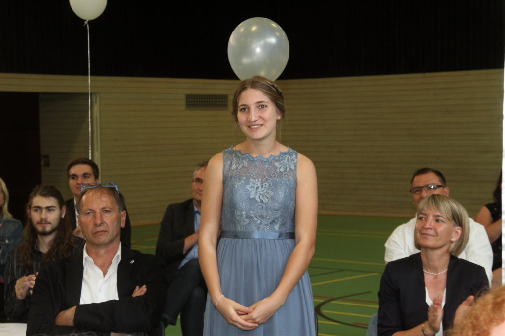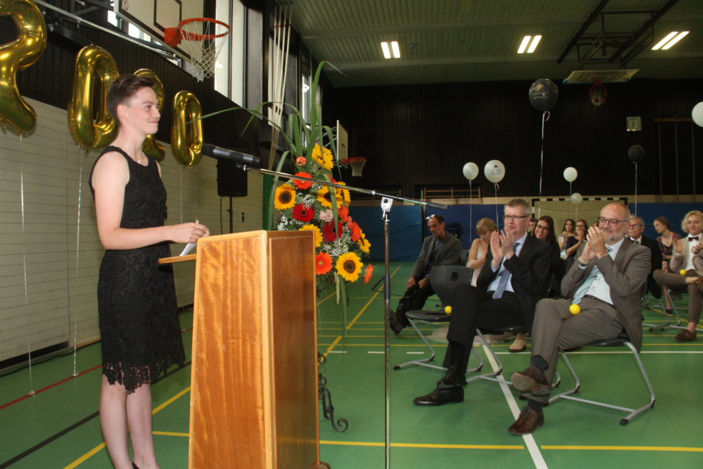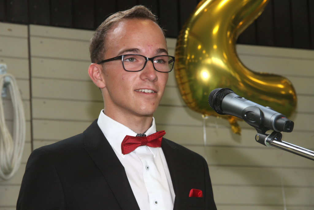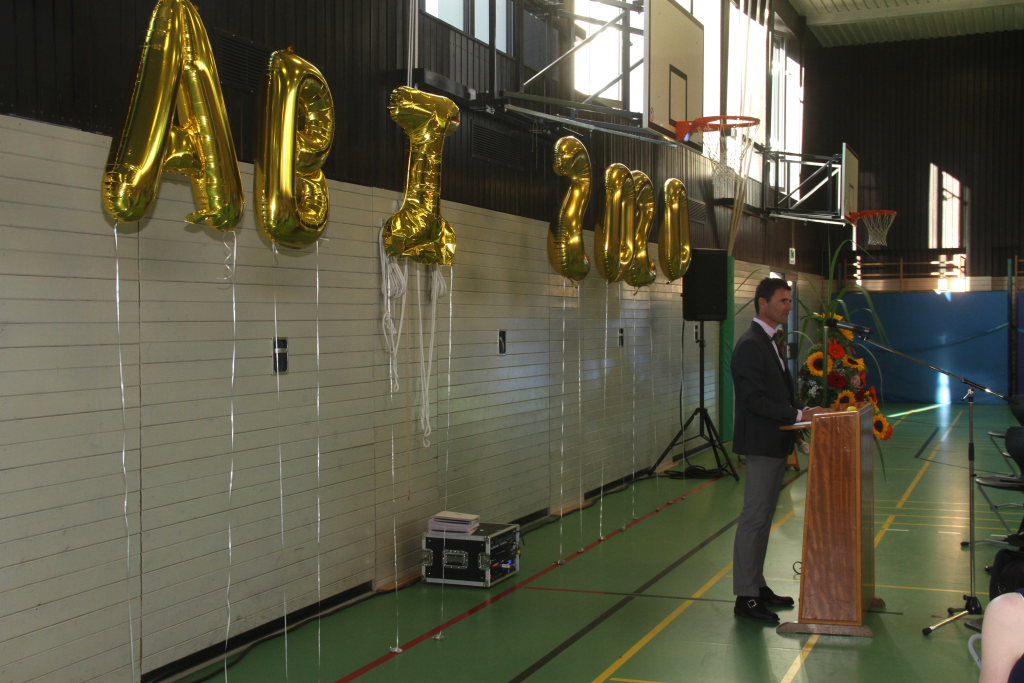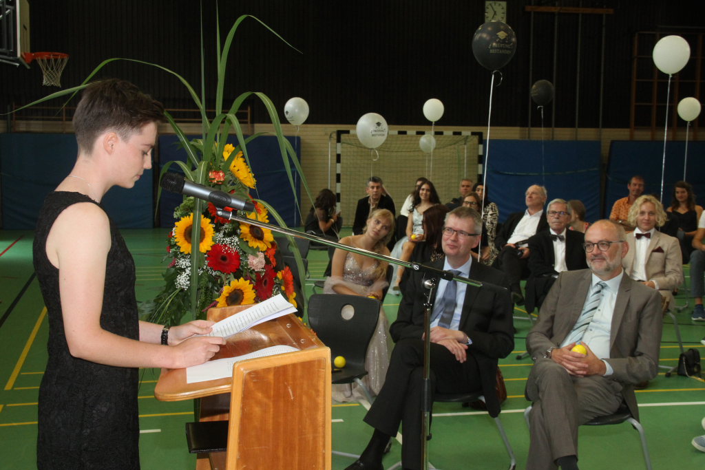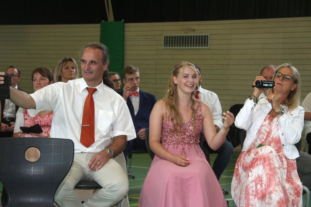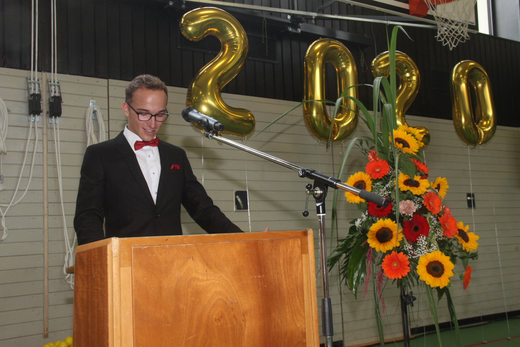 Als Vertreter der Abiturienten sprachen Alexa Gragnato, David Kling und Lukas Bettrich auf den drei Feierstunden. Gragnato ging acht Jahre zurück, als man sich ebenfalls in der Turnhalle bei der Einschulungsfeier zum ersten mal traf. Das Gefühl sei in etwa dasselbe geblieben: Die Freude es geschafft zu haben, die Angst vor neuen Herausforderungen, die Motivation neue Dinge zu lernen, Neues zu erfahren, die Zuversicht sich durch alle Schwierigkeiten irgendwie durchzuboxen. „Aber behaltet immer im Hinterkopf; wir haben den Matheunterricht überstanden, also können wir verdammt nochmal alles Überstehen.“ Hier hätten die meisten Freunde, vielleicht sogar die besten Freunde gefunden. „Diese Schule hat uns zusammengeschweißt, anders kann ich es nicht ausdrücken.“ Vor nicht allzu langer Zeit seien die Wunschberufe Prinzessin, Cowboy oder Pirat gewesen, jetzt wurde plötzlich von einem erwartet, sich für echte Berufe zu entscheiden und seine Stärken zu finden.