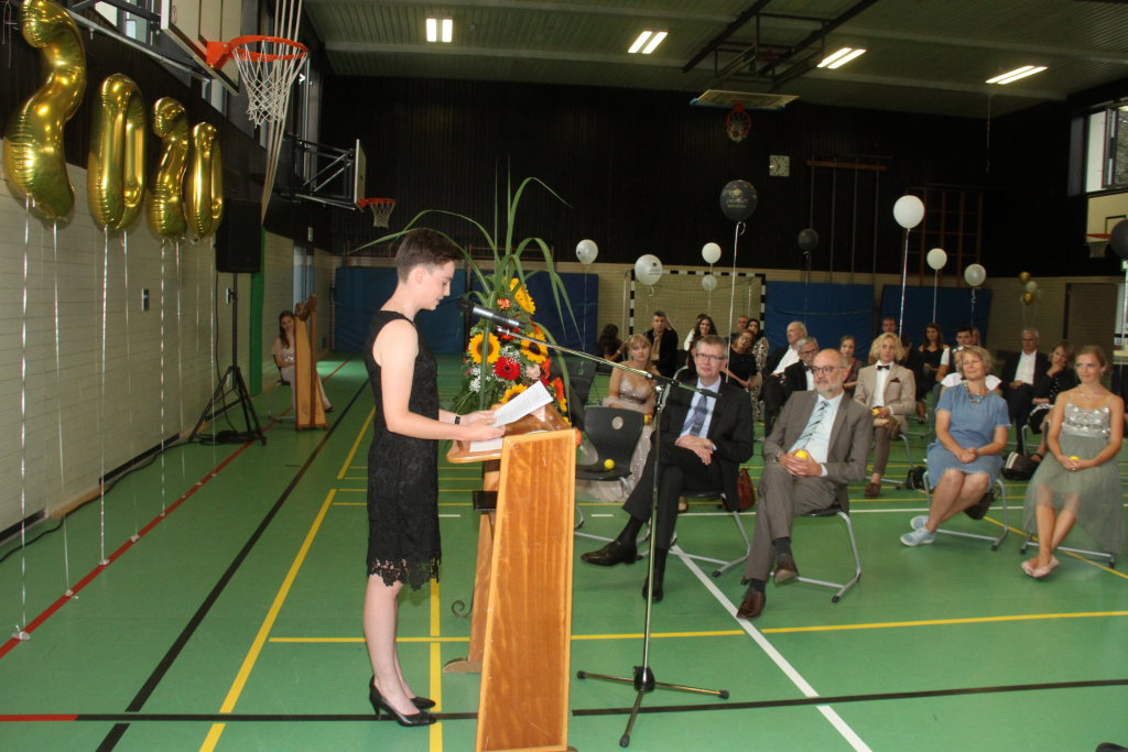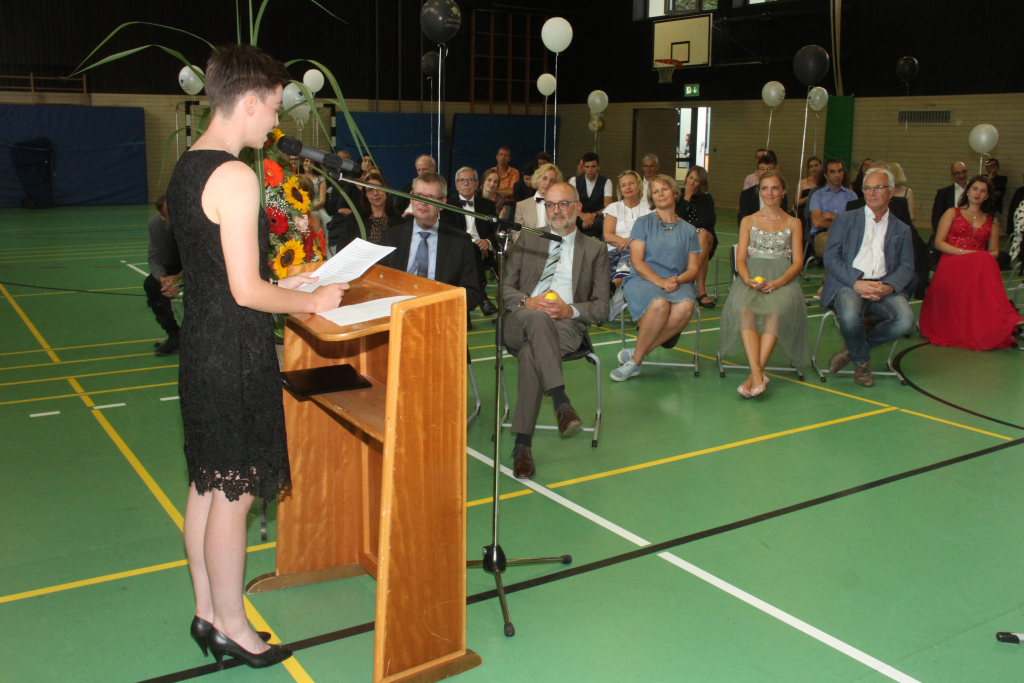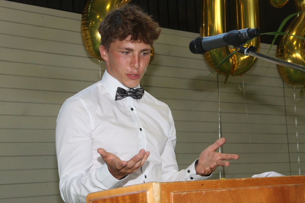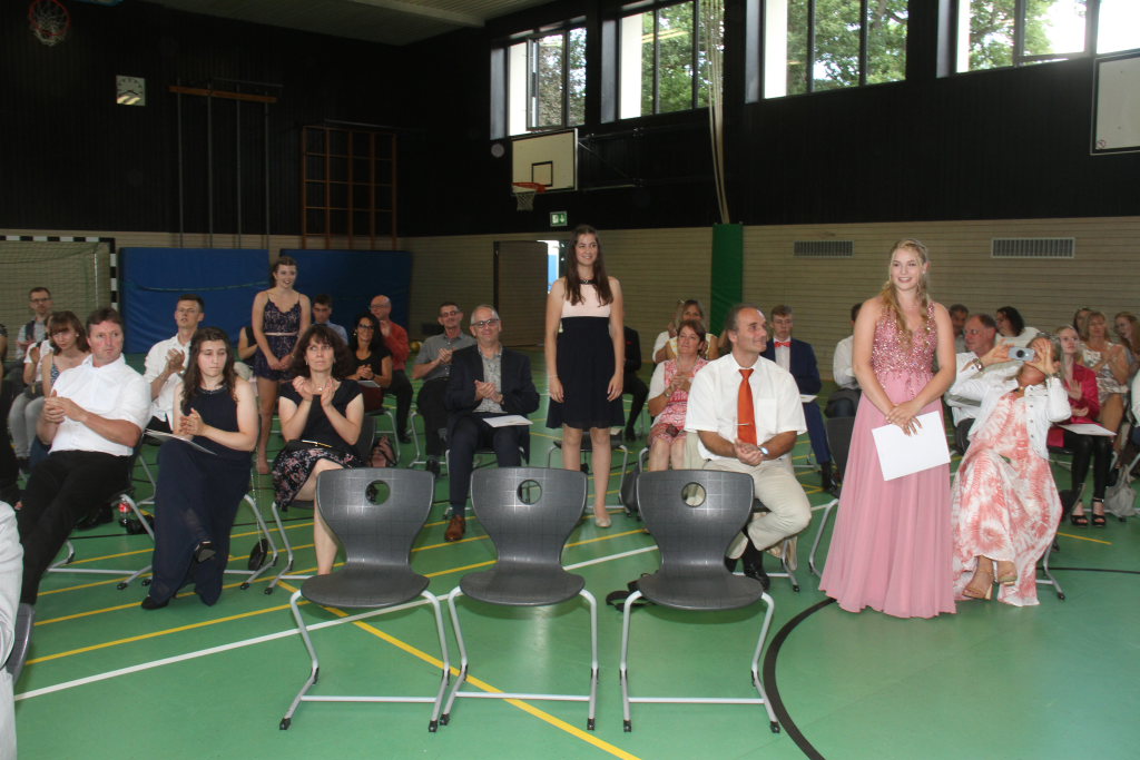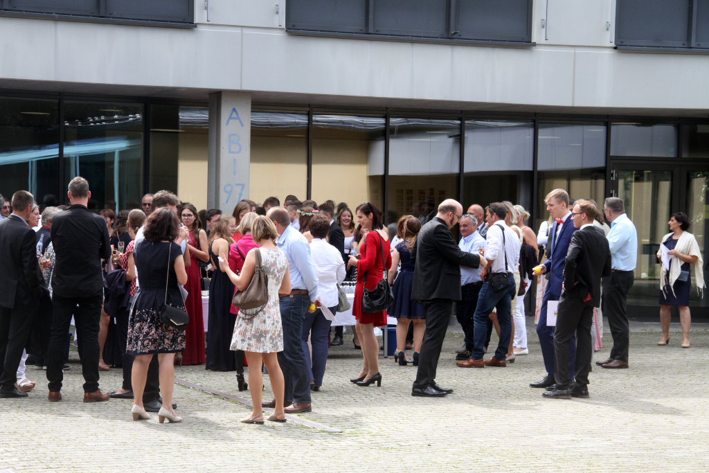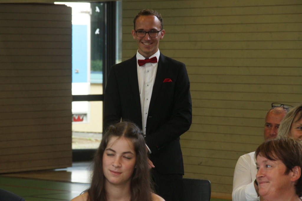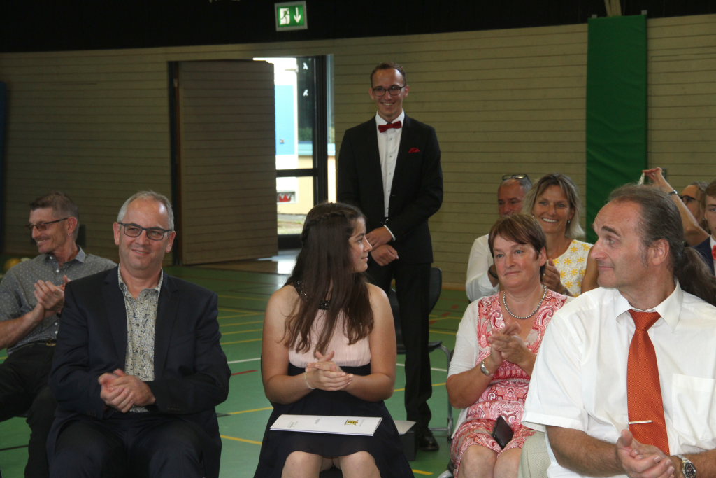 Als Vertreter der Abiturienten sprachen Alexa Gragnato, David Kling und Lukas Bettrich auf den drei Feierstunden. Gragnato ging acht Jahre zurück, als man sich ebenfalls in der Turnhalle bei der Einschulungsfeier zum ersten mal traf. Das Gefühl sei in etwa dasselbe geblieben: Die Freude es geschafft zu haben, die Angst vor neuen Herausforderungen, die Motivation neue Dinge zu lernen, Neues zu erfahren, die Zuversicht sich durch alle Schwierigkeiten irgendwie durchzuboxen. „Aber behaltet immer im Hinterkopf; wir haben den Matheunterricht überstanden, also können wir verdammt nochmal alles Überstehen.“ Hier hätten die meisten Freunde, vielleicht sogar die besten Freunde gefunden. „Diese Schule hat uns zusammengeschweißt, anders kann ich es nicht ausdrücken.“ Vor nicht allzu langer Zeit seien die Wunschberufe Prinzessin, Cowboy oder Pirat gewesen, jetzt wurde plötzlich von einem erwartet, sich für echte Berufe zu entscheiden und seine Stärken zu finden.